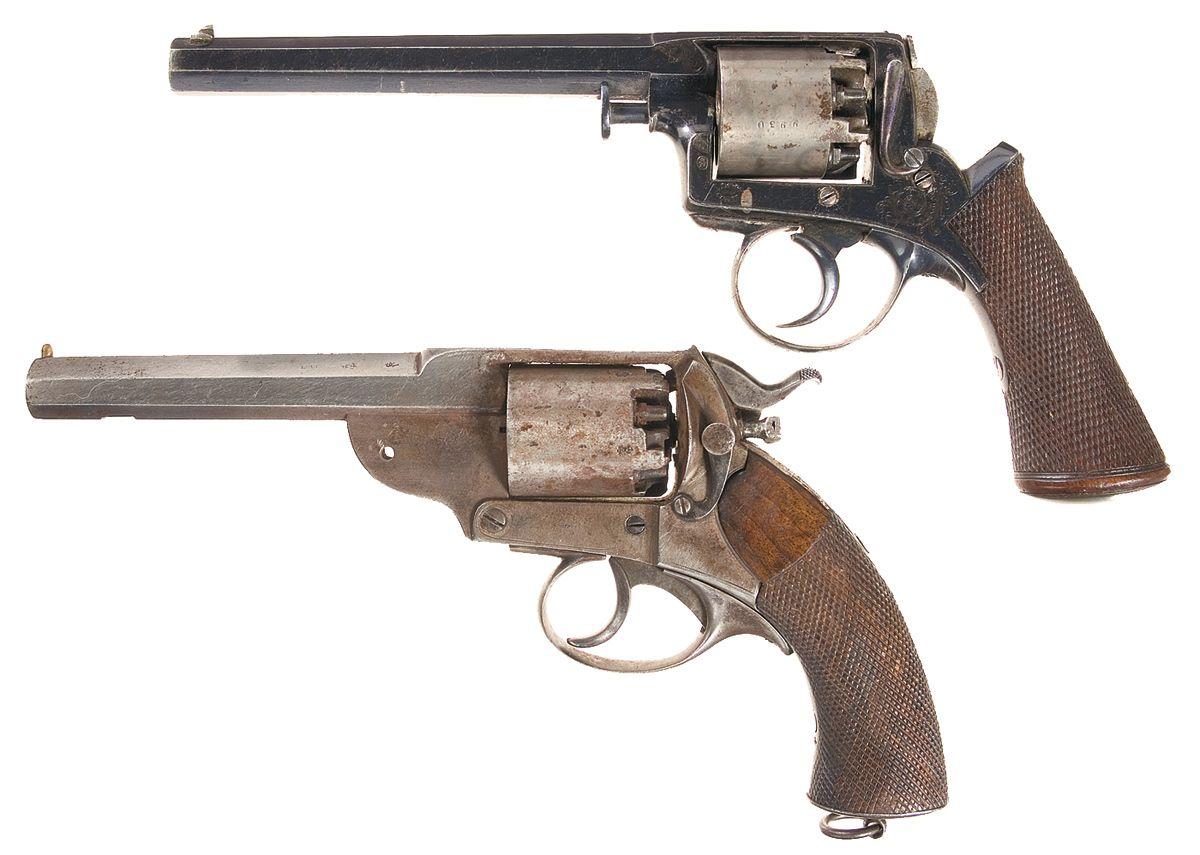 A) Fixed sights, with "ADAMS/ 1851/ PATENT" and "crown/ PF" on the left side of the frame, light scroll engraving, bobbed hammer and checkered grip with engraved buttcap and silver inscription plate.