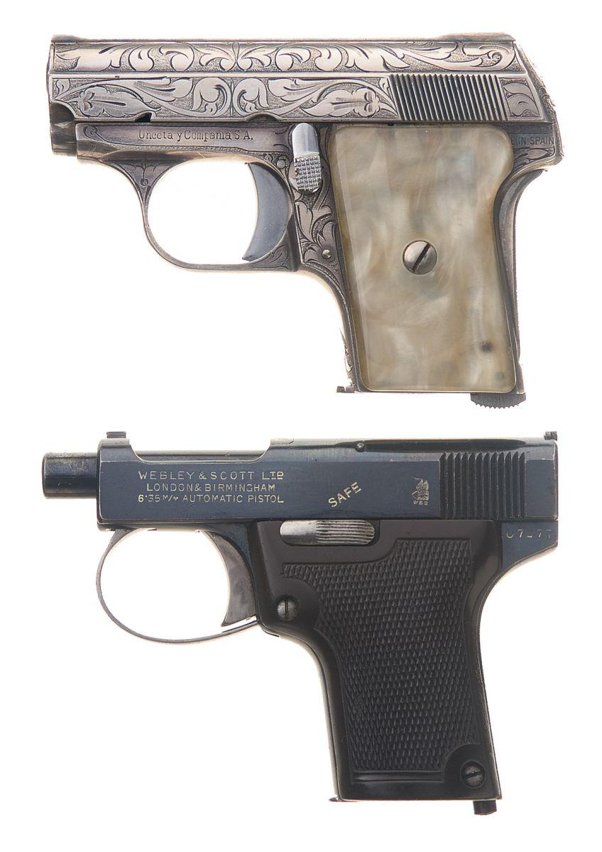 A) Factory broad floral scroll engraving overall, with matching slide and frame numbers and smooth simulated pearl grips.