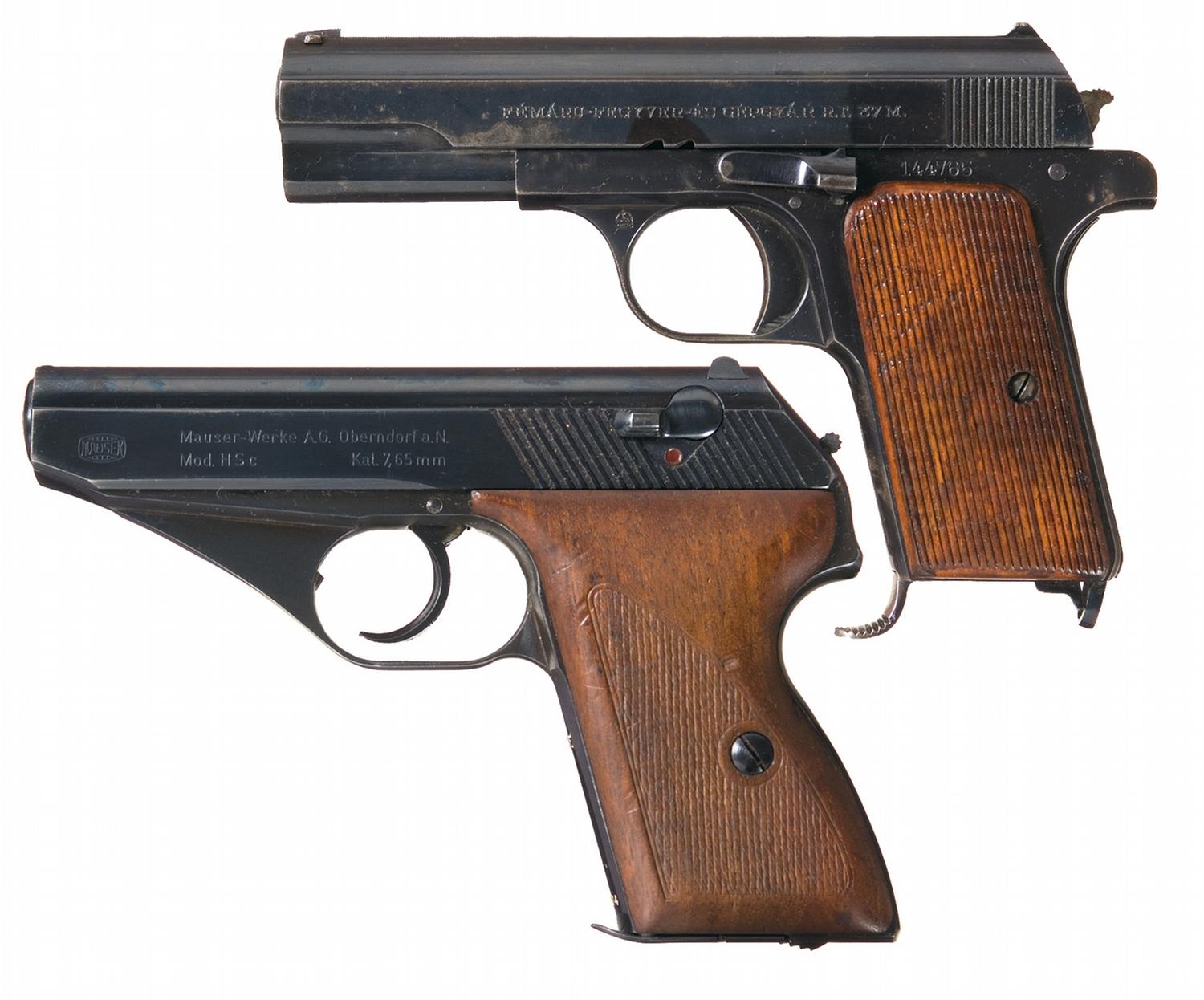 A) This Hungarian military pistol is marked "FEMARU-FEGYVER-ES GEPGYAR RT. 37M" on the slide, with "37" on the bottom of the magazine and the Hungarian crest on the left trigger guard web. Fitted with standard vertically serrated grips.
