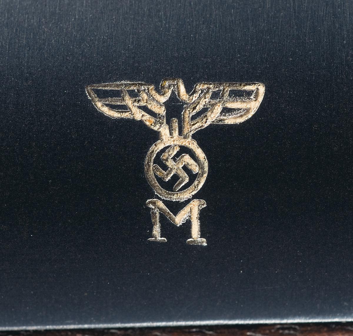 The left side of the slide has the standard early production Mauser legend. The front grip strap is marked with a large "Eagle/Swastika/M" navy proof and the serial number. The trigger guard and slide are stamped with single "Eagle/N" commercial proofs. The magazine base has the Mauser logo highlighted in white. Fitted with checkered grips.