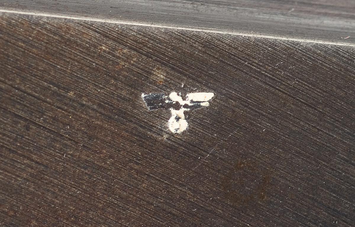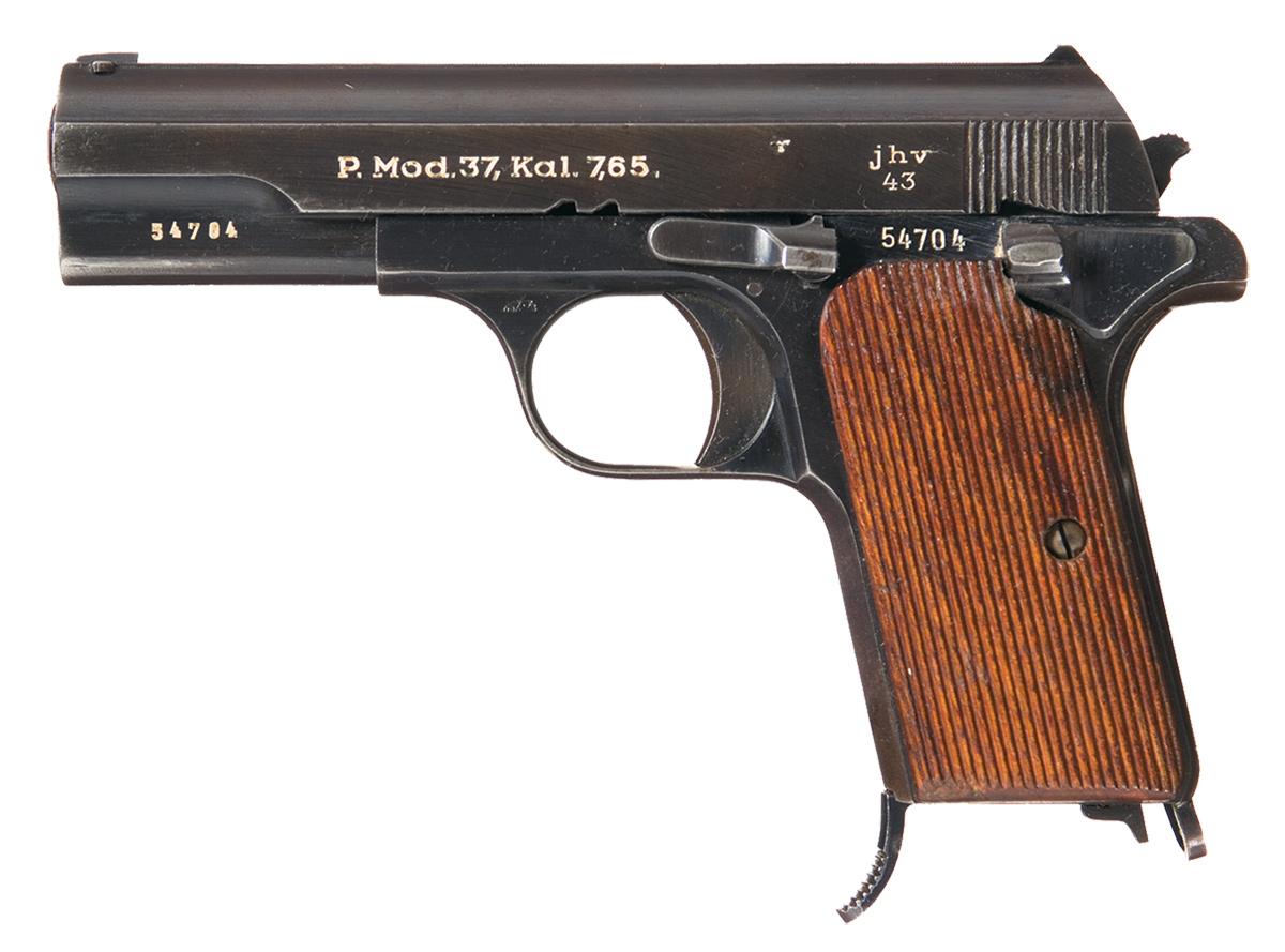 A) Marked on the left side of the slide "P. Mod. 37, Kal. 7.65." followed by an "eagle/swastika" proof and "jhv/43". The left side of the trigger guard has an eagle/WaA173 proof. Matching serial number on barrel and frame. Serrated grip panels, a lanyard staple in the base. Magazine with finger extension and base marked "P. Mod. 37".