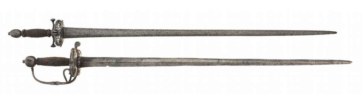 1) Possibly Dutch mid 17th Century scarf sword, 38 inches overall, with some faint engraving on the 32 inch blade. The hilt is fitted with a pair of kidney-shaped guards with pierced-through decoration, 3 1/4 inch wide crossguard, a twisted brass strip wrapped grip and a fluted pommel. 2) Mid 17th Century cavalry sword, 36 1/2 inches long, with a 30 1/2 inch hollow ground blade, pierced dot decoration on the guards, cord wrap grip and a ball pommel with light engraving on the underside. Provenance: The William Ashby Collection