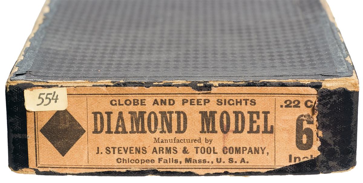 A) Manufactured from 1896 to 1916. Globe front and screw adjustable rear peep sight on a barrel marked with the two line address. Blue with nickel frame and smooth walnut grips. A museum or collector's number is marked on the butt. Complete with the correct factory box and hanging tag.