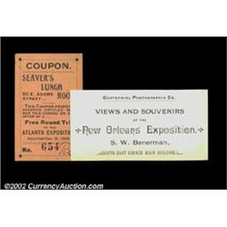 Two Expo Cards from Late 19th Century Southern Fairs. One is a business card from the Centennial Photographic Company at the New Orleans Cotton Centennial Exposition, and the other is a coupon for Seaver's Lunch Room at the 1895 Atlanta Exposition. 2 items Important notice: We expect to be auctioning lots at the rate of 200-250 per hour. Sometimes eBay Premier live bid software cannot keep up with that pace, so we strongly recommend that you place a realistic proxy bid now as insurance to avoid disappointment. Also please note that all Heritage/CAA lots purchased through eBay Premier carry a 20% Buyer's Premium. Please make sure you read the Terms and Conditions.