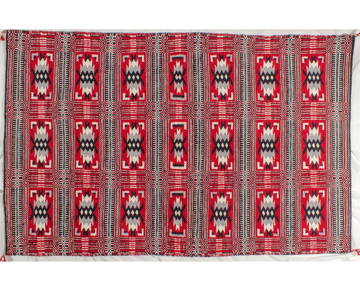 A borderless wool rug in colors of red, gray, black and natural with a design consisting of 21 rectangles with identical patterns. It measures 33.5 x 53.5.”The weaver is Lucy Wilson. The rug was purchased in 2003 from Russell Foutz’ Indian Room in Farmington, NM. Excellent condition. Fairbanks Collection - HKA#65402
