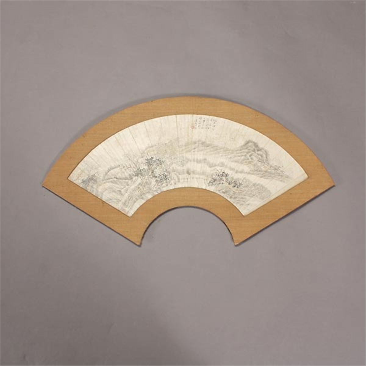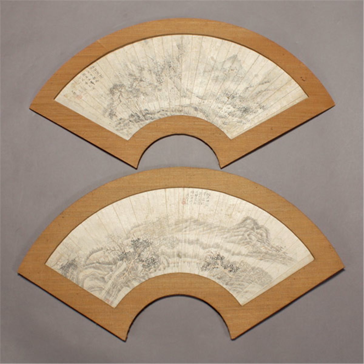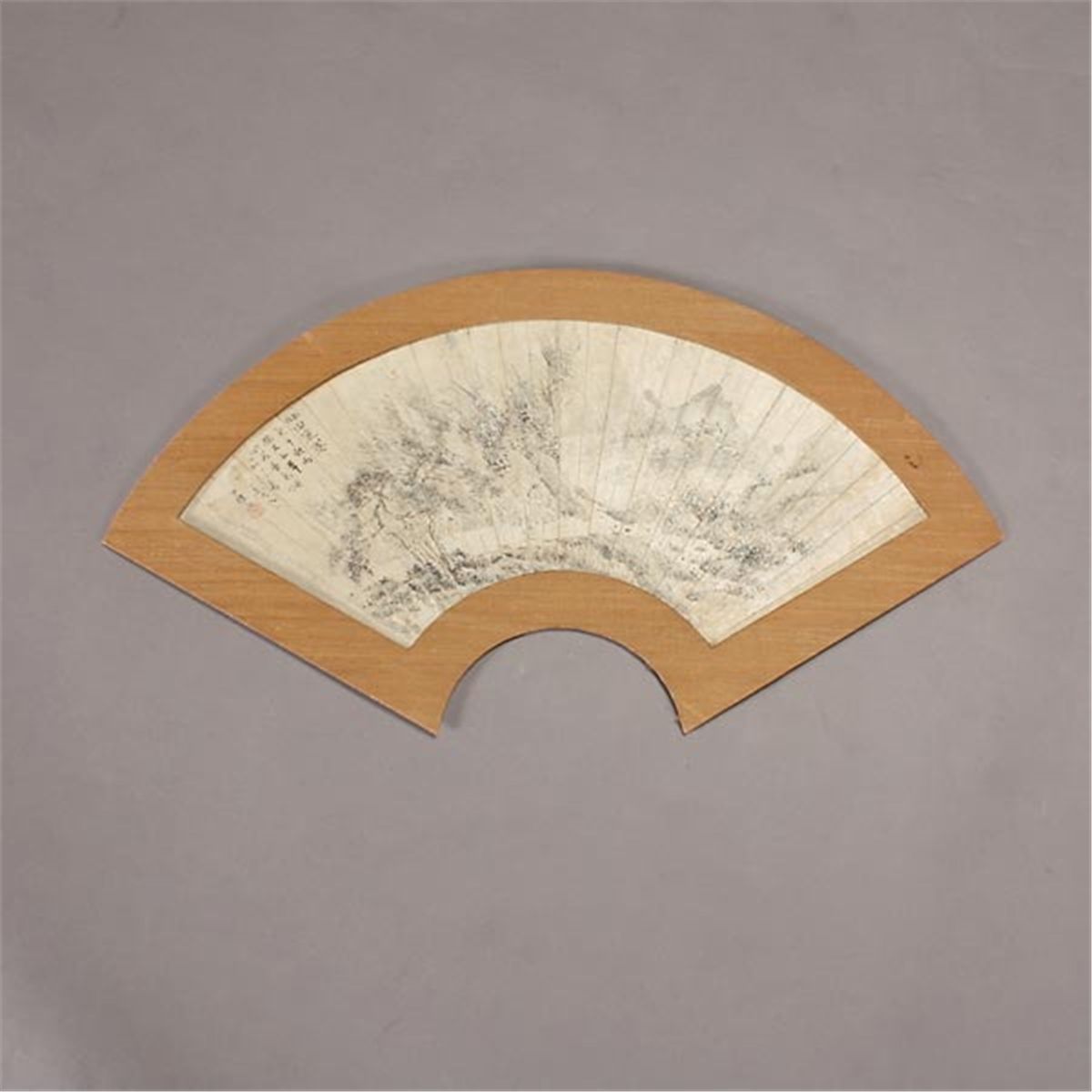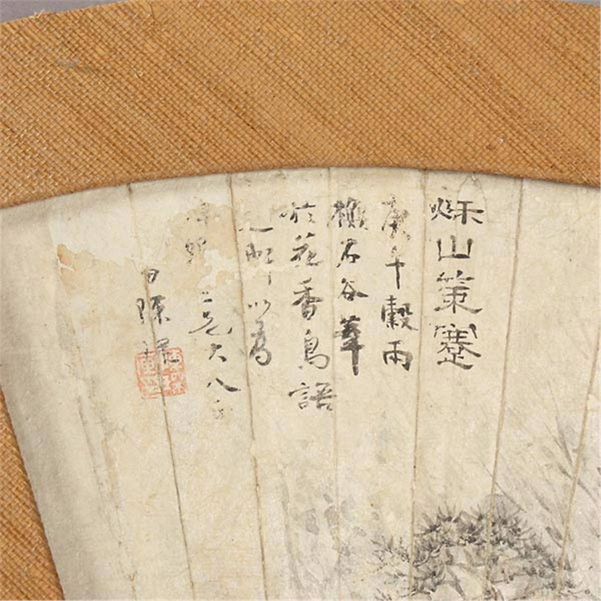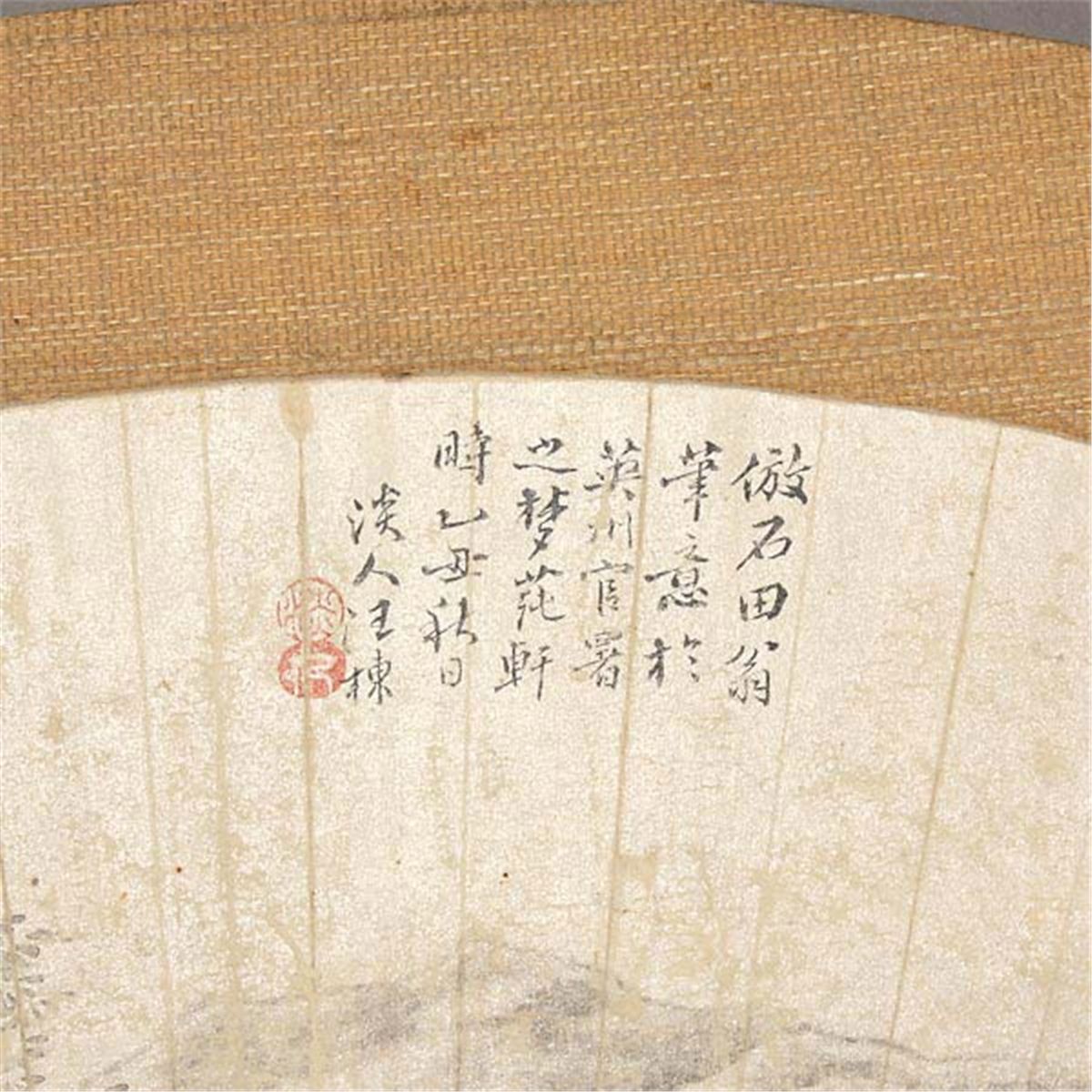Two Fan Paintings of Landscapes with Figures, Both framed, ink and color on paper, inscribed, the first with a signature 'Wang Dong,' one seal; the second titled, with a signature 'Chen Shen,' one seal Second: 7 x 19 3/4 inches (17.8 x 50.2 cm) Provenance:Originally from the Estate of Mary Hamilton of San Carlos, CA, who collected and purchased from various San Francisco antique shops during the 1950's and 1960's. [Wormholes. This condition report states major condition issues only.]