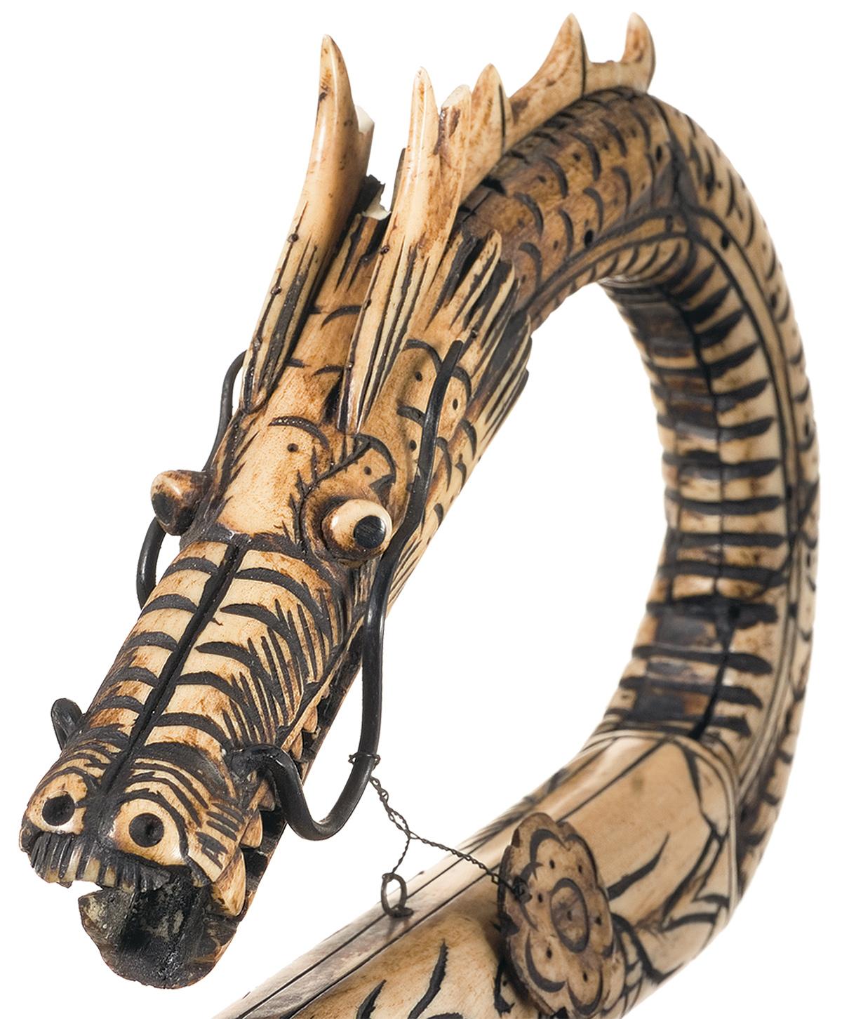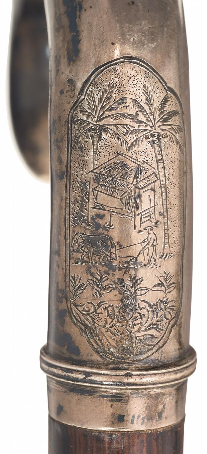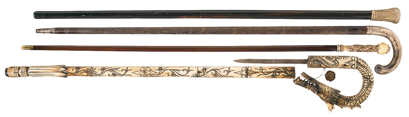 1) Inscribed silver topped walking stick, 31 3/4" long, with a nickel finished brass tip, 4/5" thick black painted shaft, and a 2 1/2" long knob top silver head, with raised scrollwork, punch-dot engraving, blank inscription field on top, and "Present to Louis Cutting 38307" around the base. 2) Engraved silver topped cane, 36" long, with a silver and brass tip, 9/10" thick hardwood shaft with carved floral designs, and a 4 9/10" long hooked silver head with an engraved panel scene of a farmer with a plow in a tropical area. 3) Silver and simulated ivory topped walking stick, 39" long, with a brass tip, 2/3" wide hardwood shaft, and a 5 3/4" long simulated ivory head with 1 1/3" wide ball top and raised floral pattern silver collars and accents. 4) Elaborately carved bone dagger cane, 37" long with a horn tip, extensive carving, 1 1/3" thick shaft, and a curved head decorated as an Eastern dragon, with raised eyes and ebony whiskers. Dagger is double edged, spear point, 8" long and unmarked.