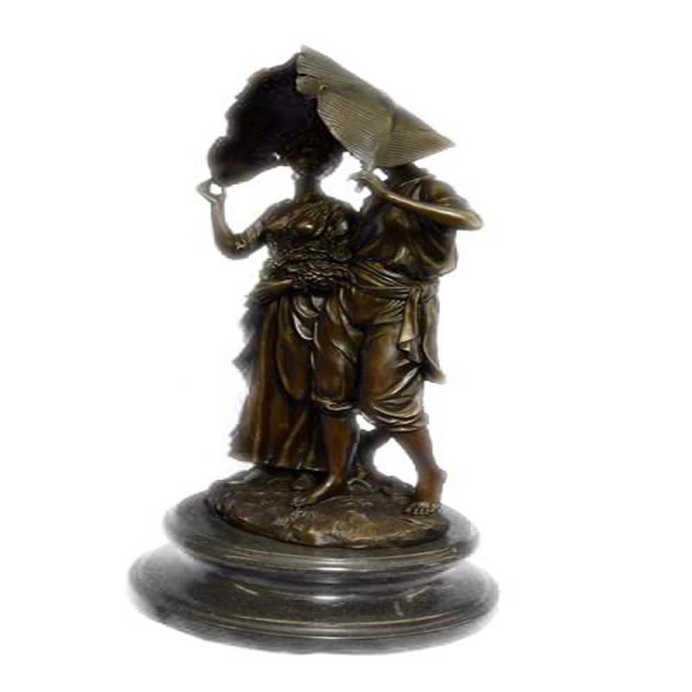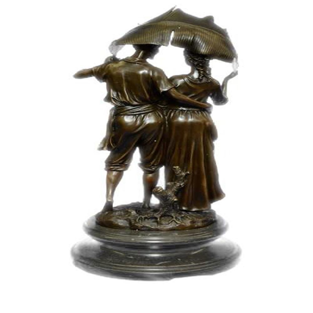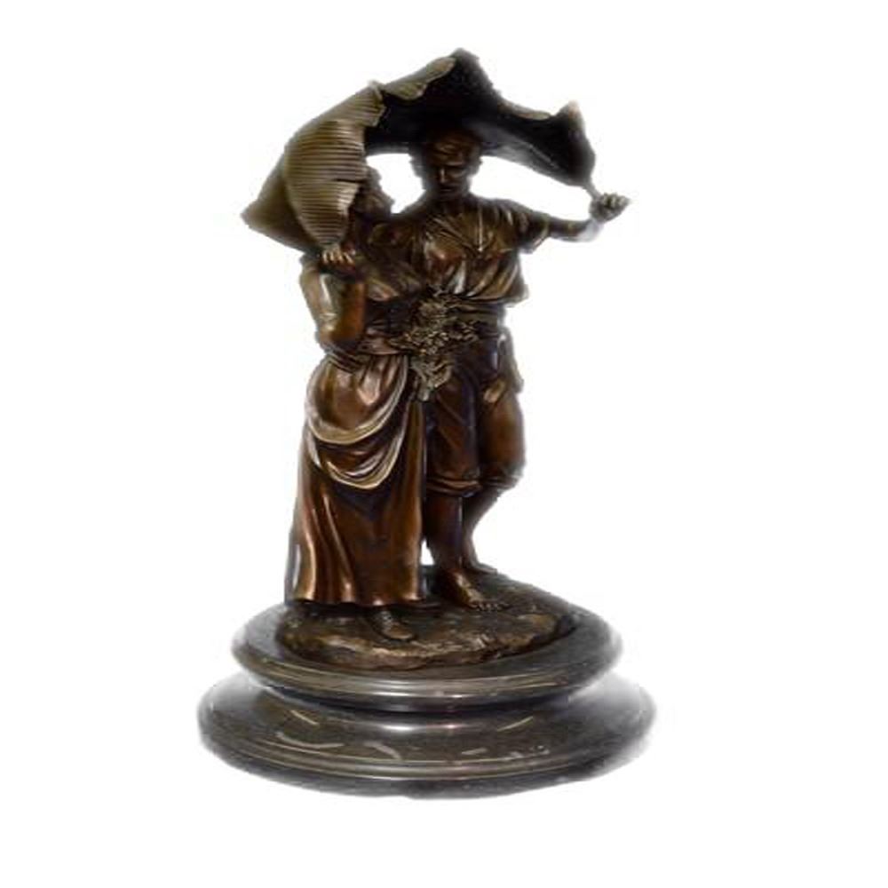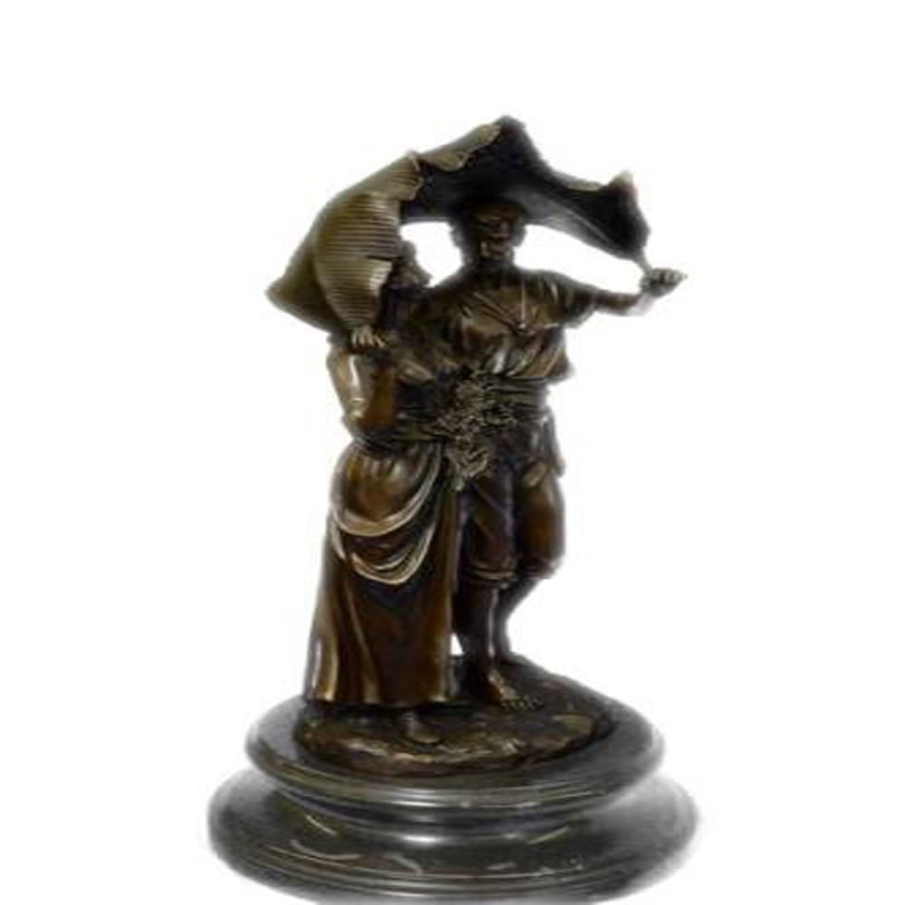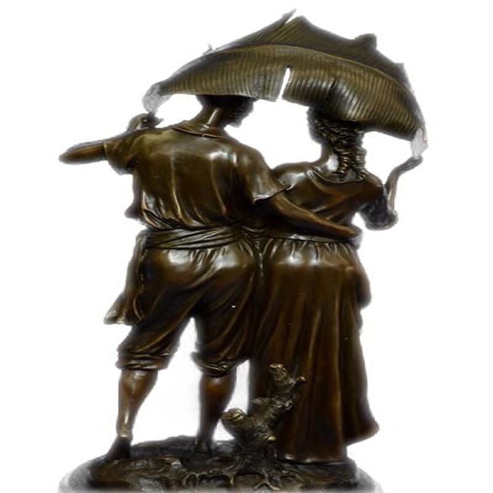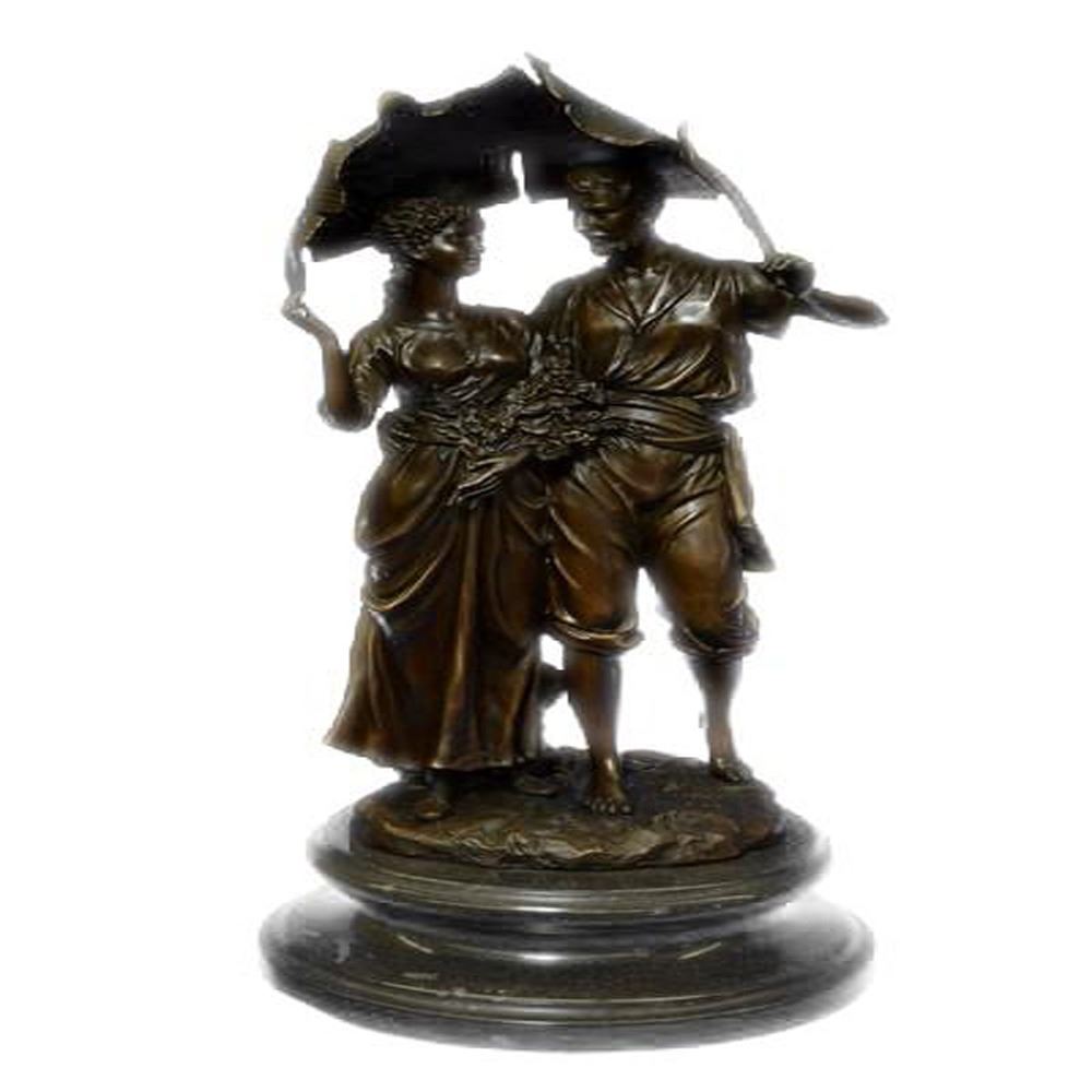 A farmers loyal wife aides him in the fields. They tend to their crops during harvest season. He pauses briefly, as she rushes over to him to offer him something to eat. She hops up on the side of his plough and talks sweetly to him. He gazes up at her loving face and smiles. He only wears a cloth around his waist, finding it too hot to wear much else. His body is well toned from hours of hard work. She wears a flowing a house dress, that hangs off her shoulder. 100% Bronze and handmade, this brown patina Sculpture was cast using the Lost Wax Method and mounted on a marble base. Bronze Dimensions with Marble Base: Height 20 X Width 9 inches. Weight: 28 LBS.