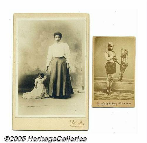 <B>Two Fascinating Photos: A Cabinet Card Depicting a Grown Woman Holding Hands with Princess Wee Wee, a Black Woman Featured in Side Shows and Circuses, and a CDV of a Black Boy with a Boa Constrictor</B></I> The "Princess" was 21 years old, stood 18" in height and weighed 9 pounds. The photographer includes his imprint at bottom, "Wendt, Boonton, N. J." Together with a carte-de-visite of a young black boy suffering from localized depigmentation and standing next to a huge boa constrictor; titled at bottom, "Spotted Boy, and his Companion," also a sideshow feature. Two extraordinary items. Lot:250