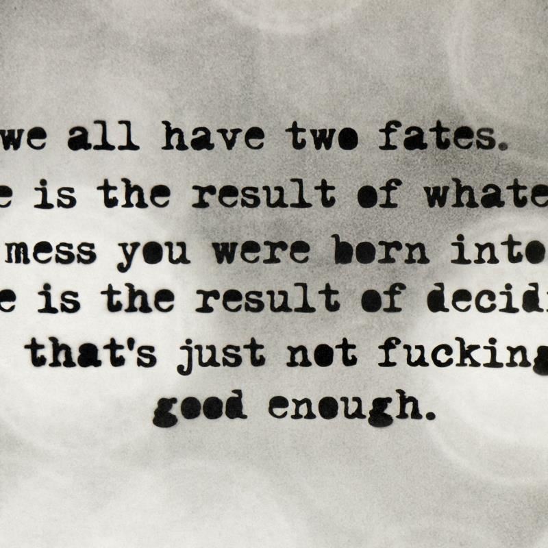 "Two Fates" is a limited edition spray paint stencil on paper, numbered hand signed by the artist. Includes Letter of Authenticity. Measures approx. Measures approx. 24" x 18" (with border); 22" x 16" (image). Due the thinness of the paper there may be minor imperfections.