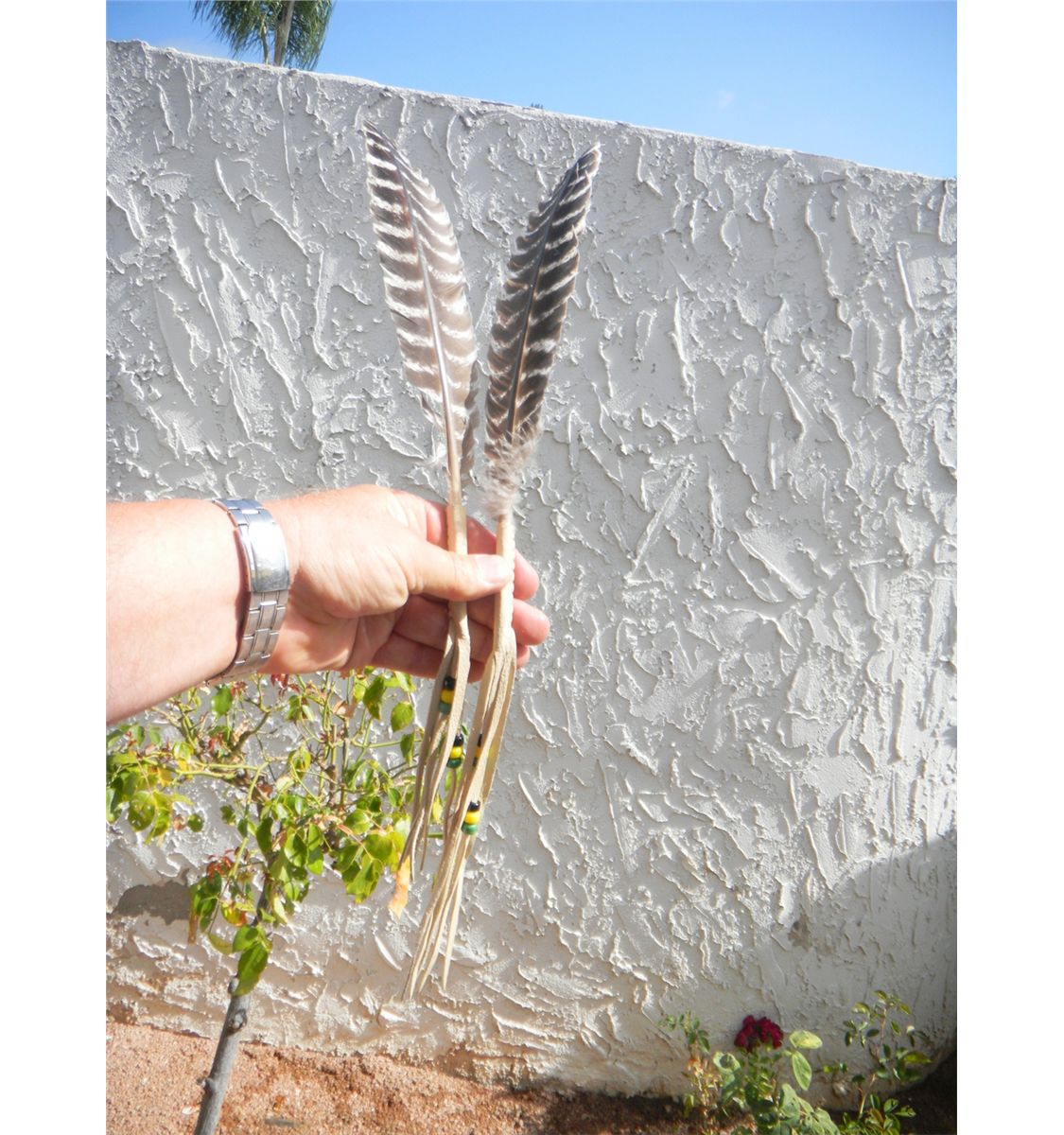 Two Feathered drops. Turkey feathers with deer hide and glass drops. Overall length is 22 inches and 19 inches. Condition Very Good. Shipping $15.00