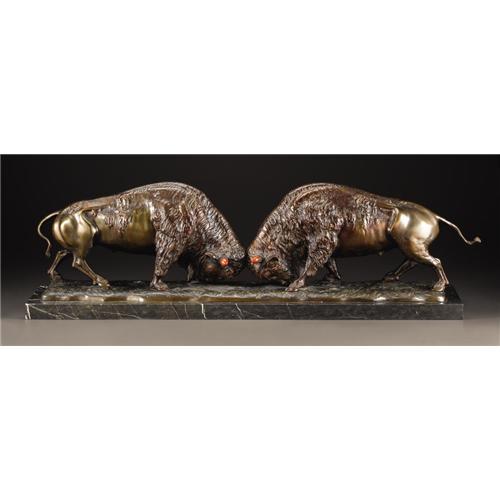 <B>A Bronze Figural Group of Two Fighting Bison</B></I><BR><BR>M. Bauer, Austrian<BR>Twentieth Century<BR>Bronze with brown patina and ivory<BR>Incised: <I>WB/ Bauer</B></I><BR>8.5 inches x 32 inches x 7 inches<BR><BR>A fine cast with excellent chasing, featuring two powerful bison in combat. <B>Condition Report:</B> Overall good condition normal signs of wear as appropriate with age<BR><BR><b>Shipping:</b> Requires 3rd Party Shipping (<a target="_blank" href="http://www.heritageauctions.com/common/shipping.php">view shipping information</a>)