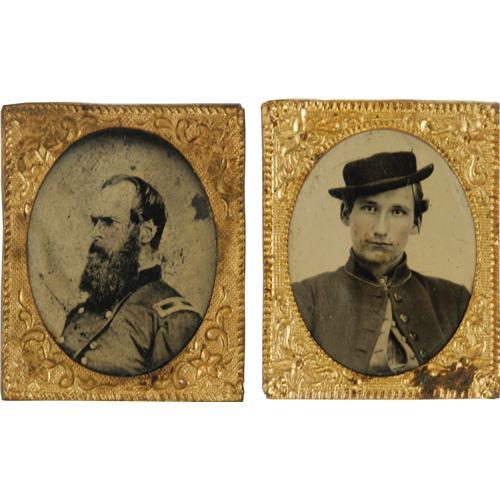 <B>Two Fine Civil War Soldier Tintypes.</B></I> One in E.M. frockcoat and jaunty hat (near-mint), other in a Lt. Colonel's uniform (minor wear). These are not the standard small 0.75" x 1" "gem" frames, but much scarcer, larger 1" x 1.25" ones.