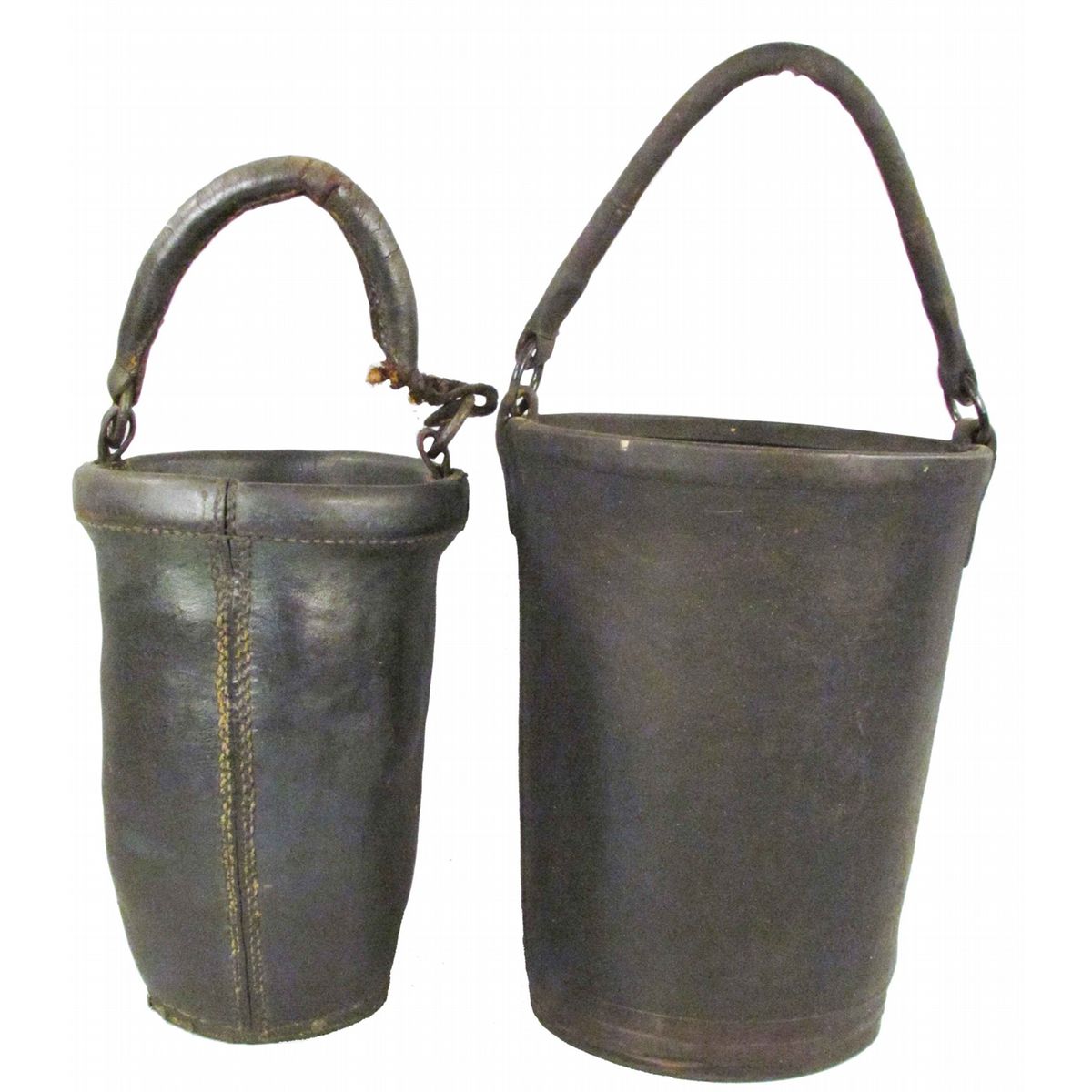 Two Fire Buckets. Leather bucket smaller size measures 11 inches, minor separation handle seam and base. Volcanized bucket, Ca. 1870. Some damage to bottom and side, 12 inches tall.