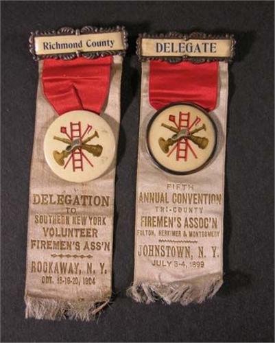 Two fire fighting celluloid button ribbons 1) 5th Annual Convention Tri County Fire Assoc. Delegate Johnstown, NY July 3 & 4 1899, 6.5" long, 2) Richmand Co. delegation Southern NY volunteer fire association Rockaway, NY Oct 18, 19, 20, 1904, 6" long.