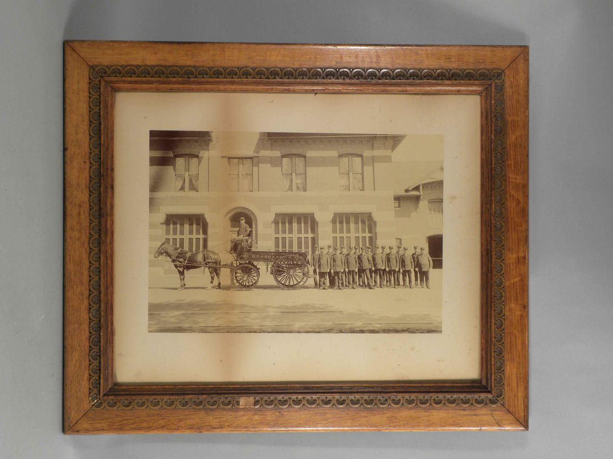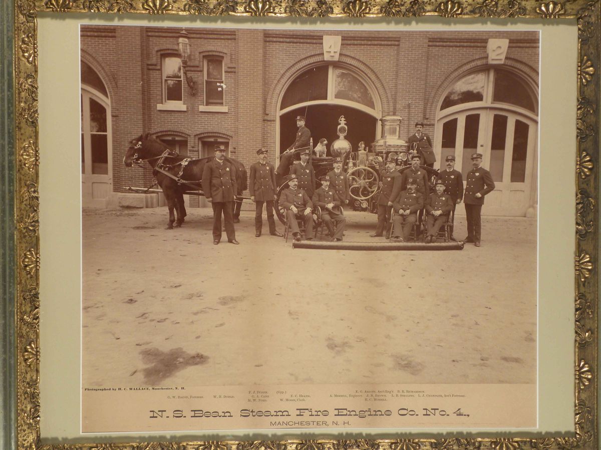 Photograph of Horse Drawn Fireman's Wagon w/men in front of station. Kearsarge No. 2. Albumen photo. Very minor fading and staining around mat otherwise good condition. 15 3/4 X 10 3/4 inches. Early Albumen Photo of the N.S. Bean Steam Fire Engine No. 4 Manchester, NH. Picture of the steam fire engine with men (identified)in front of station. Minor paper scrape at 11:00 otherwise very good condition. 16 1/2 X 14 1/2 inches image only.