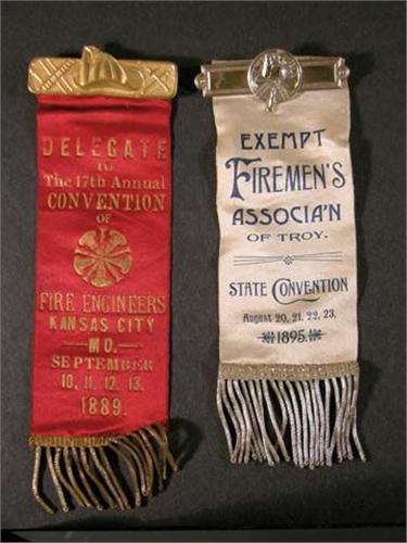 Two fireman's badge/ribbon. 1) 1889 Kansas City, MO. 2) 1895 Troy, NY. Ex. cond.