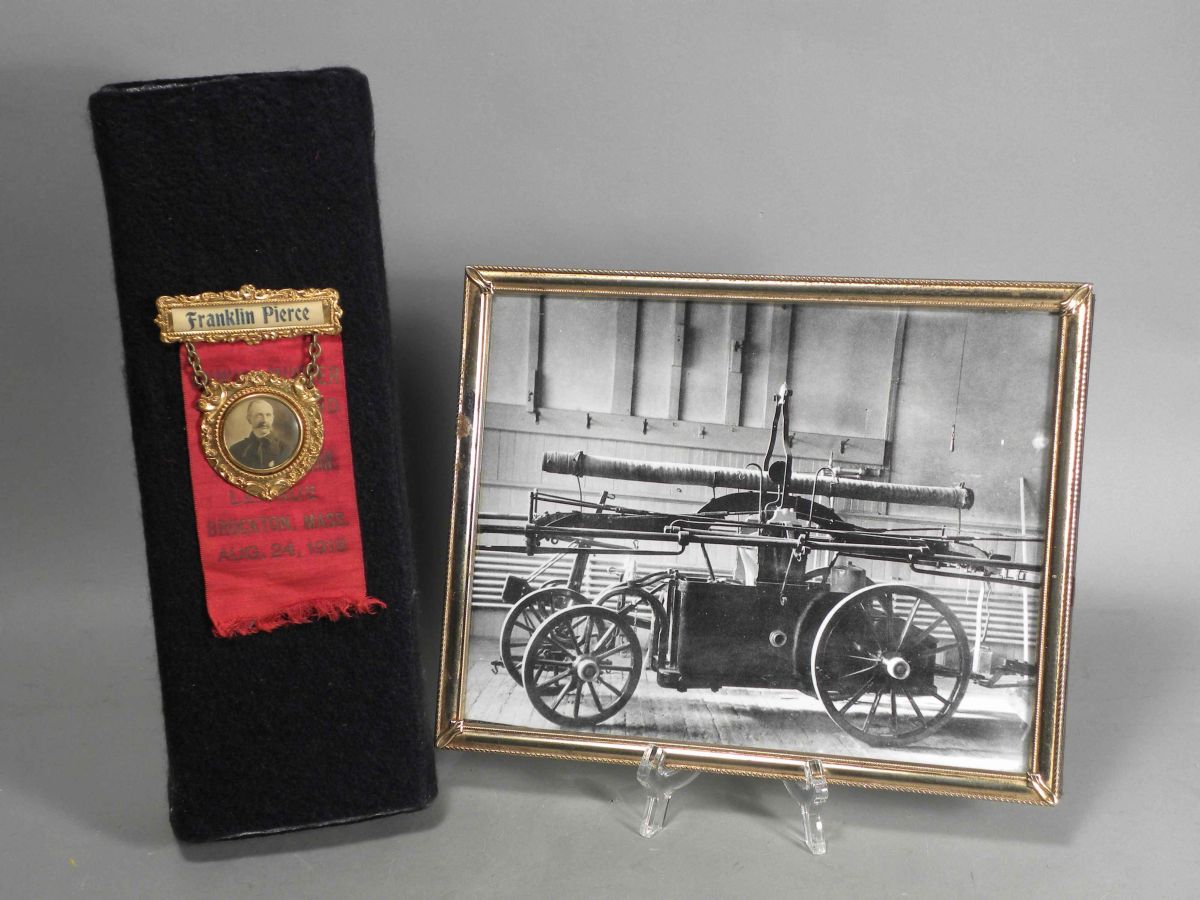 Lot of Two Firemen's Items for the engine Franklin Pierce, Hunneman Handtub. The items include his celluloid badge/photo from a New England Muster dated August 24, 1918 Brockton, Mass and a photo of the engine.