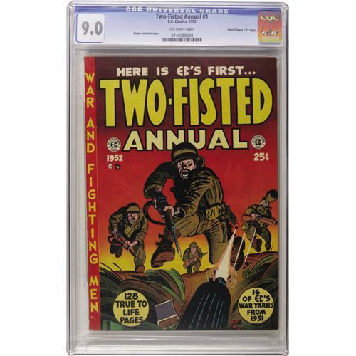 <B>Two-Fisted Annual #1 Davis Crippen ("D" Copy) pedigree (EC, 1952) CGC VF/NM 9.0 Off-white pages.</B></I> This book in high grade, are we <I>kidding</B></I>? No we're not! This issue's square bound spine frayed easily, and we had never seen one that didn't have a little chip or chunk missing along the spine... until now. This one was obviously never read, and remember, there are no Gaines File copies of this issue! The contents are re-bound EC war comics from the previous year. Overstreet 2006 VF/NM 9.0 value = $945; NM- 9.2 value = $1,200. CGC census 10/06: 1 in 9.0, 1 higher. <I>From the Crippen Collection.</B></I><BR><BR><b>Shipping:</b> Slabbed Comic (<a target="_blank" href="http://www.heritageauctions.com/common/shipping.php">view shipping information</a>)