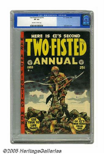 <B>Two-Fisted Annual #2 (EC, 1953) CGC VF 8.0 Off-white to white pages.</B></I> A Jack Davis cover is only one of the highlights of this 128-pager. And we wish we could tell you what some of the other highlights are, but the fact is, each copy of these annuals is different from every other, as whatever issues EC happened to have left over were bound up with this new cover. When you see a copy of this square bound book, it's usually pretty banged up; our offering is only bested by one 9.0 copy in CGC's census as of this writing. Overstreet 2005 VF 8.0 value = $518. CGC census 6/05: 1 in 8.0, 1 higher.