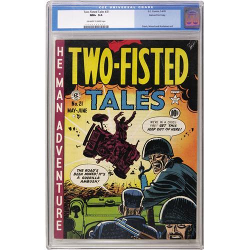 <B>Two-Fisted Tales #21 Gaines File pedigree 7/10 (EC, 1951) CGC NM+ 9.6 Off-white to white pages.</B></I> A Harvey Kurtzman cover from 1951 just can't look any better than the one on this copy. Even with the number of Gaines file copies in existence, only one issue of #21 has been found nicer by CGC than this one so far. And this is one of the bargain-valued titles from EC's heyday, with art by Kurtzman, Wally Wood, and Jack Davis. Overstreet 2006 NM- 9.2 value = $520. CGC census 10/06: 1 in 9.6, 1 higher.<BR><BR><b>Shipping:</b> Slabbed Comic (<a target="_blank" href="http://www.heritageauctions.com/common/shipping.php">view shipping information</a>)