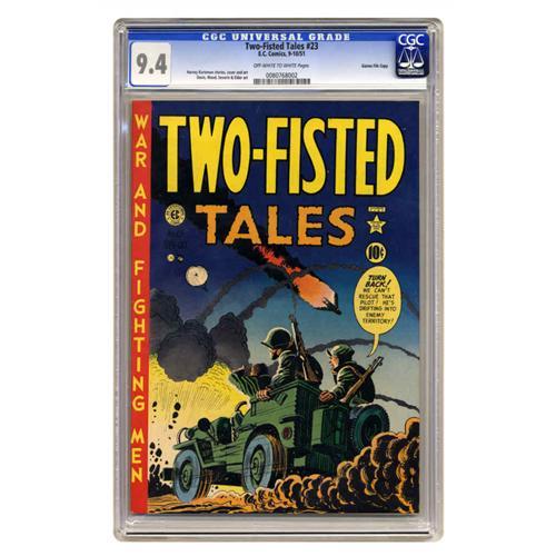 <B>Two-Fisted Tales #23 Gaines File pedigree 10/10 (EC, 1951) CGC NM 9.4 Off-white to white pages.</B></I> The Korean war had center stage in 1951, and Harvey Kurtzman and Jack Davis each drew a hard-hitting tale set in that conflict for this issue. But both World Wars are also represented, with Wally Wood drawing a World War I story and John Severin and Bill Elder teaming up on a World War II tale. The cover is by Kurtzman. Overstreet 2005 NM- 9.2 value = $380. CGC census 12/05: 1 in 9.4, 3 higher.