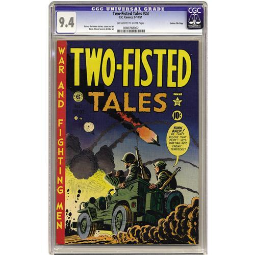 <B>Two-Fisted Tales #23 Gaines File pedigree 10/10 (EC, 1951) CGC NM 9.4 Off-white to white pages.</B></I> The Korean war had center stage in 1951, and Harvey Kurtzman and Jack Davis each drew a hard-hitting tale set in that conflict for this issue. But both World Wars are also represented, with Wally Wood drawing a World War I story and John Severin and Bill Elder teaming up on a World War II tale. The cover is by Kurtzman. Overstreet 2006 NM- 9.2 value = $400. CGC census 03/06: 1 in 9.4, 3 higher.
