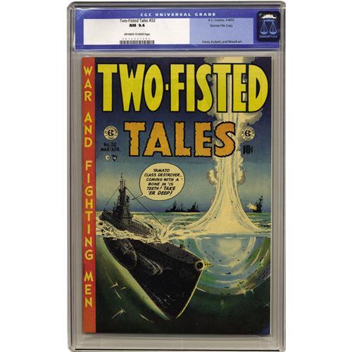 <B>Two-Fisted Tales #32 Gaines File pedigree 3/9 (EC, 1953) CGC NM 9.4 Off-white to white pages.</B></I> One of very few stories Joe Kubert drew for EC is this issue's "Tide!" The issue's unusual in other ways -- it's one of the few in this series' run not to have a Harvey Kurtzman cover as well as one of the few with a naval theme (and it's a superb naval scene by none other than Wally Wood!). Also contributing interior art were Wood (drawing a story of Hannibal, no less), Jack Davis, Johnny Craig. Overstreet 2006 NM- 9.2 value = $300. CGC census 03/06: 2 in 9.4, 1 higher.
