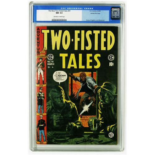 <B>Two-Fisted Tales #41 Gaines File pedigree (EC, 1955) CGC NM 9.4 Off-white to white pages.</B></I> The last issue of <B>Two-Fisted</B></I> saw the comic come full circle -- it began as "He-Man Adventure," went on to "War and Fighting Men," and ended up back with straight "Adventure" both on the cover and in the interior contents. Jack Davis drew this issue's "Mau Mau" cover, while John Severin, Bernard Krigstein, Wally Wood, and George Evans all contribute story art. Although CGC recognizes this as a Gaines File Copy, no certificate accompanies the book. Overstreet 2005 NM- 9.2 value = $225. CGC census 12/05: 1 in 9.4, 2 higher.