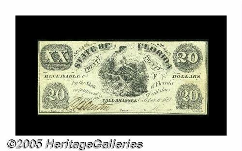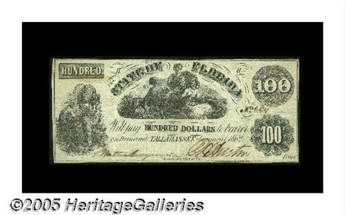 <B>Two Florida State Issues.</B></I><BR>Tallahassee, FL- State of Florida $20 Oct. 10, 1861 Criswell 4 VF<BR>Tallahassee, FL- State of Florida $100 Jan. 1, 1862 Criswell 10 VF.<BR>