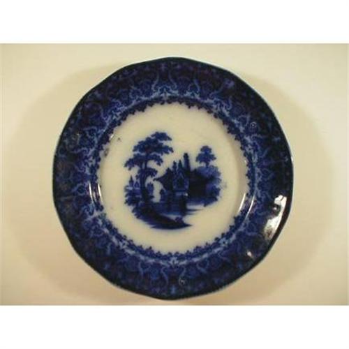 Two Flow Blue Plates in the Design Arabesque. One plate is marked, one is not marked on the back. The condition of the plates is good. Non cracks, chips or hairlines. Both plates have some wear and glaze crackling of age, and utensil markings. One of the plate has a improfection in the design of the house, looks a little nick, but this is under the glaze, a factory flaw, see first picture. The normal stilt markings of firing you see on antique pottery. Buyer pays S?H $15.00, plus Insurance. We ship Priority Mail.