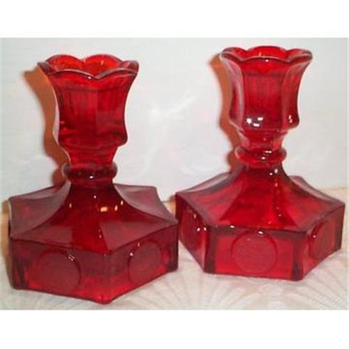 <tr><td>Title:Two Fostoria Ruby Red Coin Glass Candle Holders</td></tr>