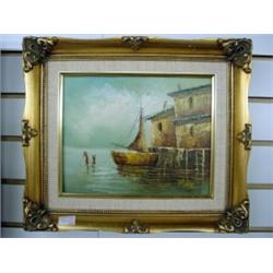 Late 19 Century Shadow Box Frame, with Print of Cardinals, and Oil on Canvas, Signed Rico, Dock Scene.
