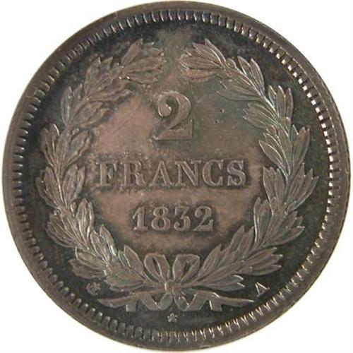 Two Francs 1832A NGC MS-65. Superbly lustrous with attractive light-medium toning