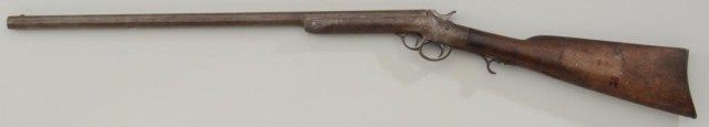 Two Frank Wesson single shot rifles; the first rifle is unmarked, except serial #1221, .44 cal., 24” octagon barrel, brown patina, wood stock, fair bore, hammer does not stay on full cock; overall uncleaned appearance.The second rifle is marked “F. Wesson” and is serial #264, .32 cal., 24” octagon barrel, wood stock; this gun is in overall fair condition with a heavy dark patina, action does not open and the hammer spur has beenbroken off; dark bore, overall good butt stock. Est.: $125-$250.
