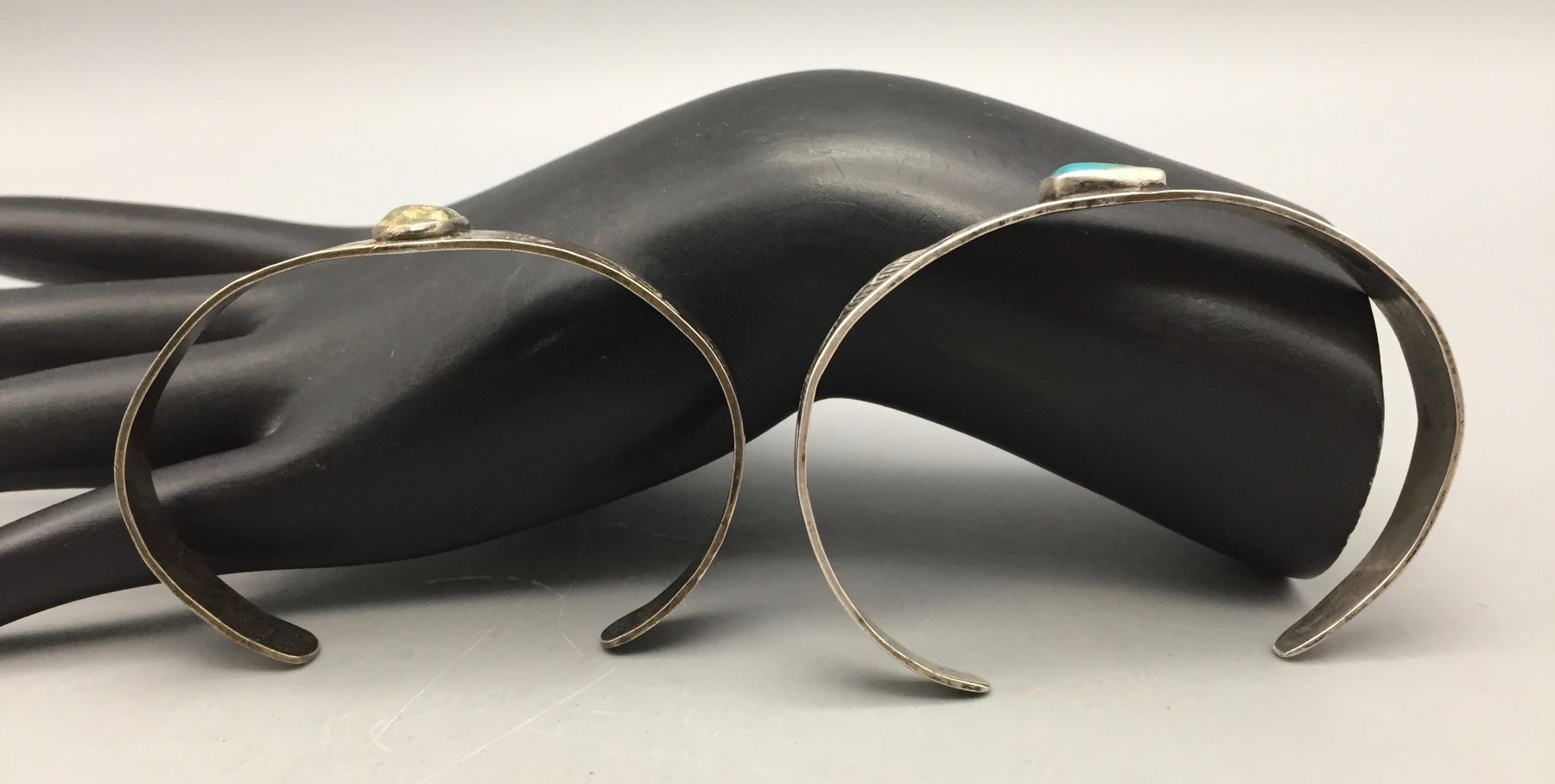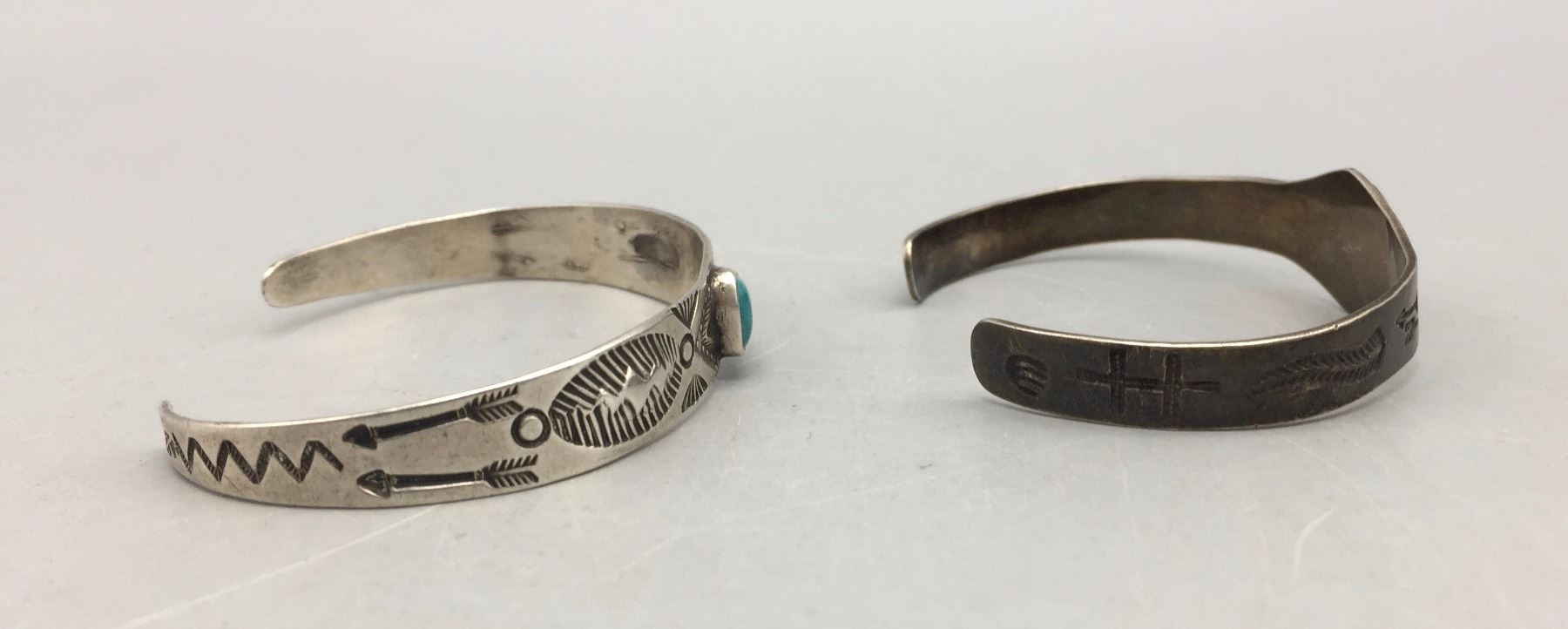 Description: Presented for sale in this lot is two, Fred Harvey Era turquoise and sterling silver bracelets with stamped details. Maker: No hallmarks, but vintage Navajo style. Approx. Age: Circa 1930s. Size: Fits a 6-1/4” wrist and is 1/2” wide. Fits a 6-1/2” wrist and is 3/8” wide. Combined weight of 21.8 grams. Condition: Good for their age, normal wear expected. Please look closely at the pictures - they are an important part of our description. Shipping: There will be a $5 handling / packaging fee for shipping this lot. The actual cost of postage will be added on top of that.