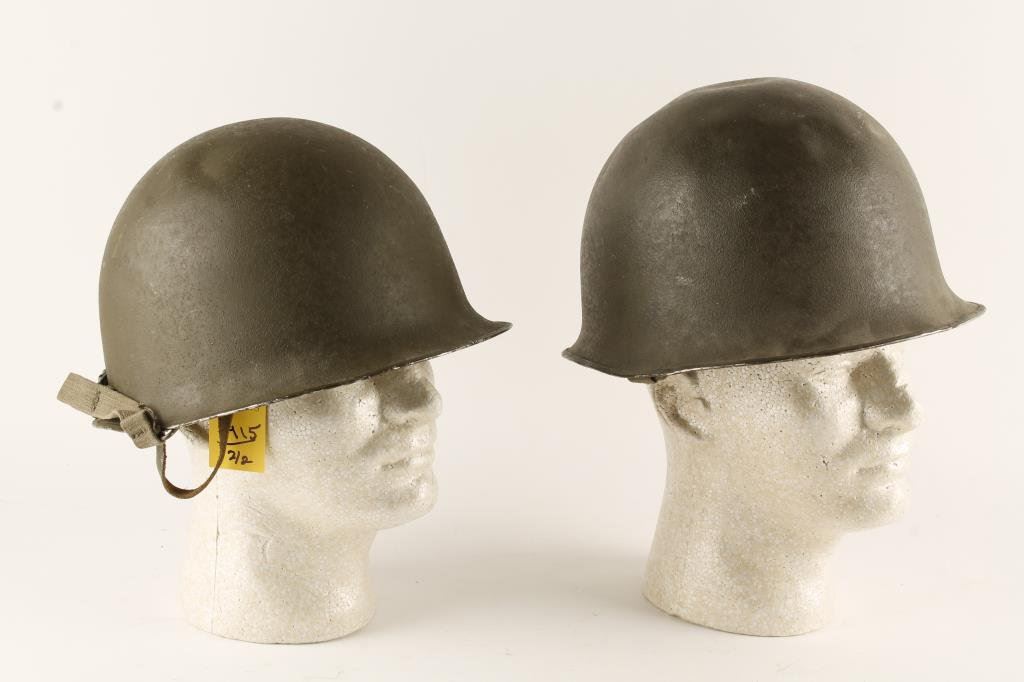 Two French 1951 helmets; according to consignor, found in rice paddy in Viet Nam; soldiers never located. Est.: $100-$200.