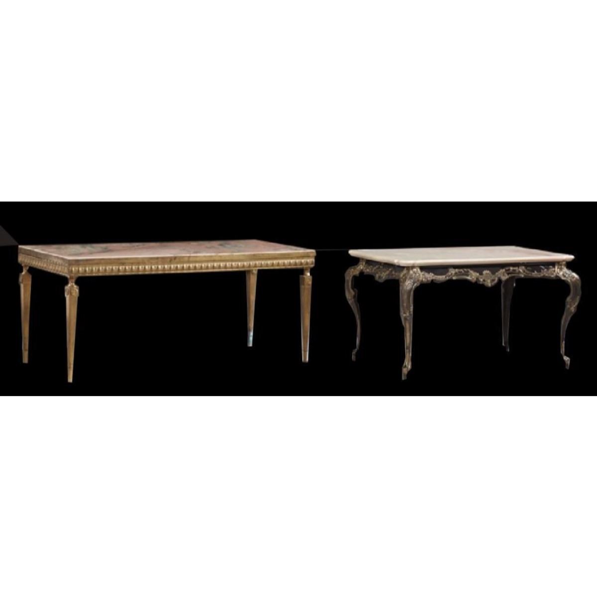Two French Marble Top Metal Coffee Tables, 19th c., consisting of a Louis XVI style example, the rectangular highly figured pink marble on a brass base with tapered reeded legs; and a Louis XV style example, the serpentine figured creme marble over a pierced scrolled bronze skirt on cabriole legs with painted toes, H.- 17 in., W.- 39 3/4 in., D.- 18 in. (2 Pcs.)