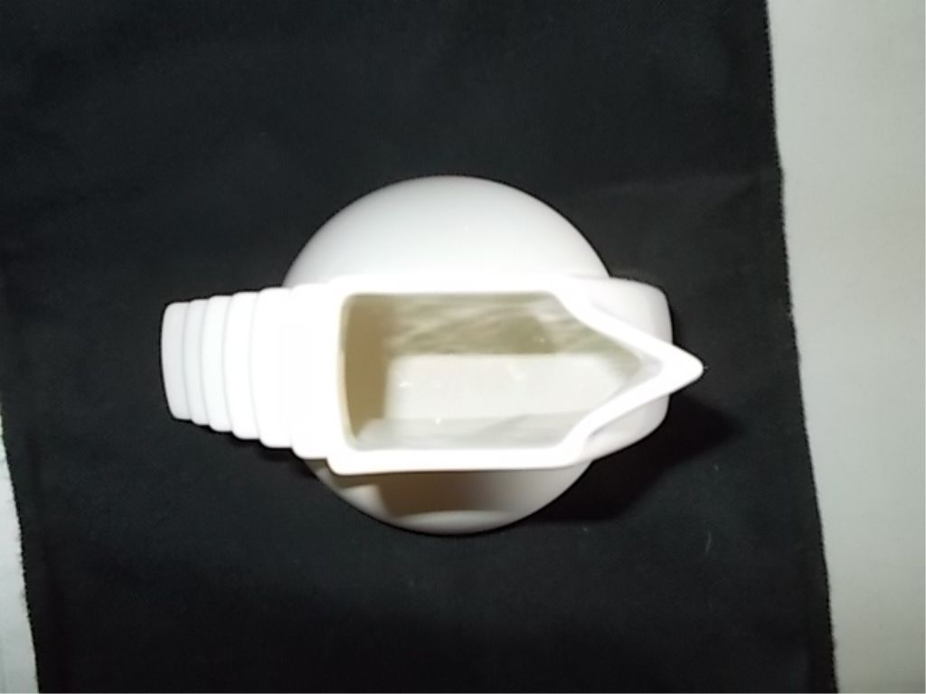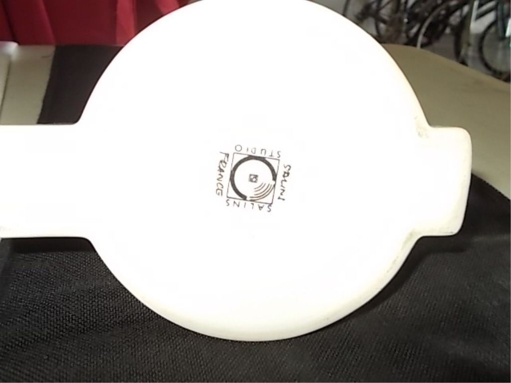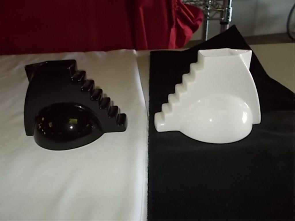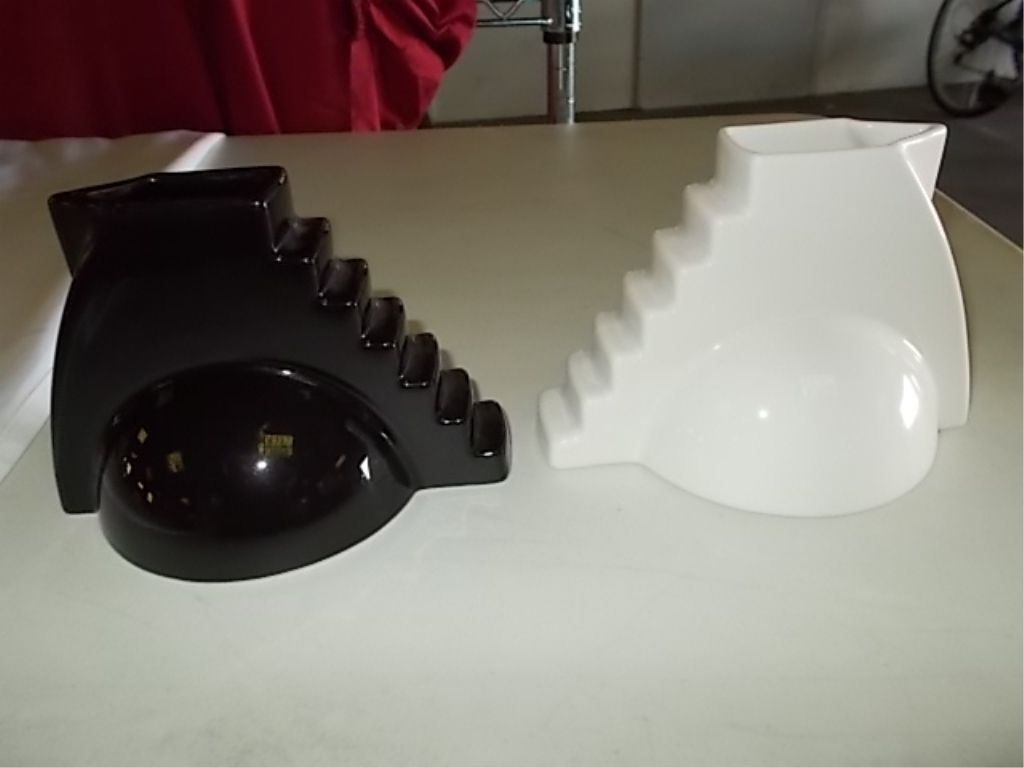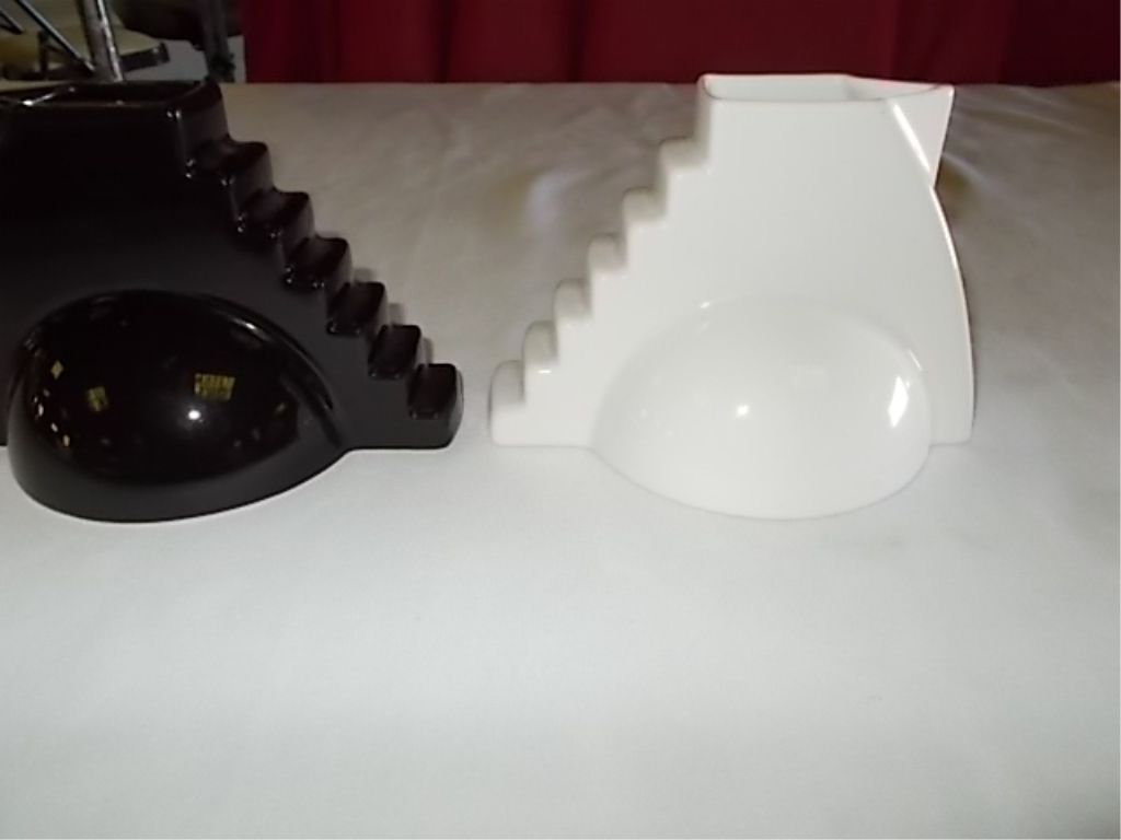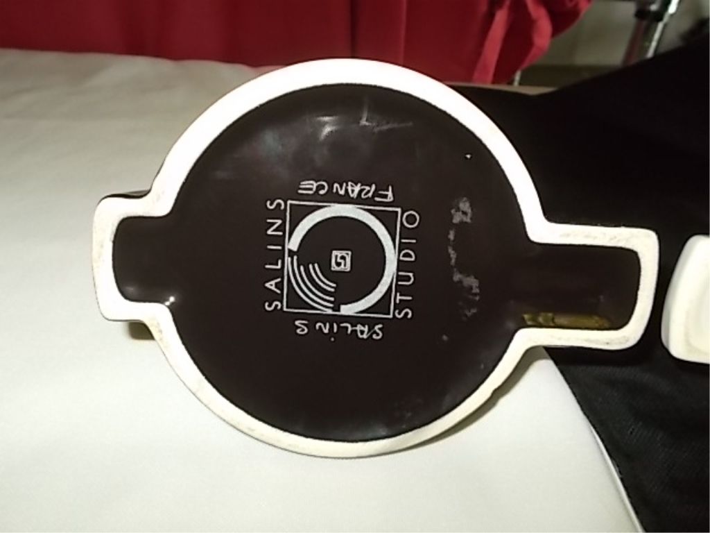 3t – Two French Retro Art Deco Salins Studios Cream Pitchers One white, one black Salins Studios cream pitchers, 6 1/8 wide” x 4 ¼” high. Art deco style, start a collection, add to a collection, Salins Studios has coffee pots, cups, sugars pots, sets, tea pots and trays. These two stair stepped pitchers side by side are a great deco combo.
