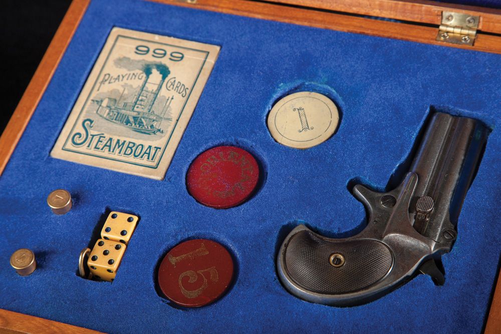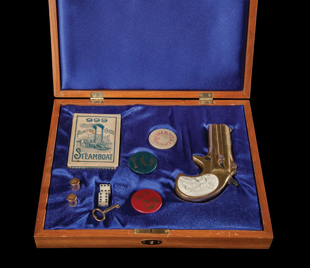 Two "Gambler’s" Deringer Box Sets with Chips, Dice and Cards. a) Box includes 359 assembly number, circa 1888, Remington ’95 Double Deringer, .41 rf, 3" barrels; along with 3 vintage poker chips, vintage dice, 2 modern “dummy” .41 rf cartridges, and a complete deck of Steamboat cards, all cased in modern box with key. There probably never were many real Gambler’s sets but this is a great way to display the contents. CONDITION: Deringer retains 95% original nickel, bores are rough, blued parts have gone plum, excellent 2-piece hard rubber grips, hinges are solid, cards, dice and chips are in excellent condition. b) This box includes 169 or 691 assembly number, circa 1888, Remington ’95 Double Deringer, gold washed, .41 rf, 3" barrels; along with 3 vintage "Oriental Saloon" poker chips, vintage bone dice, 2 modern .41 rf cartridges, and a complete deck of Steamboat cards, all in modern case with key. CONDITION: Deringer 100% gold wash remains, rough bores, other metal parts nickeled, custom grips with nude figure; hinges are solid, dice and chips are excellent, cards are very good.