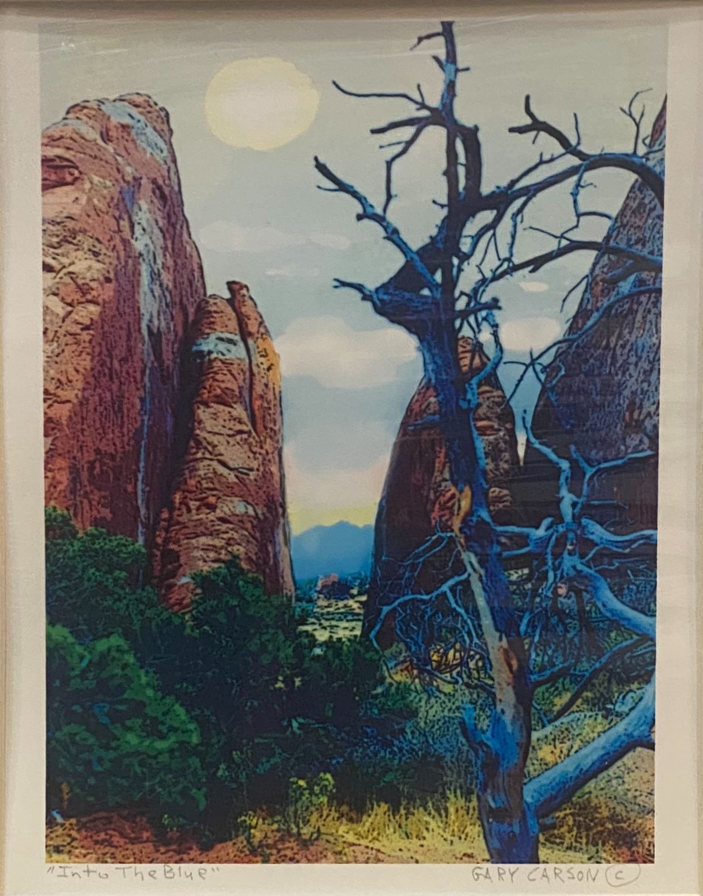 Titled: Into the Blue. The Image measures 6 5/16ths by 9-inches. A Mat adds approximately 2-inches to each side.