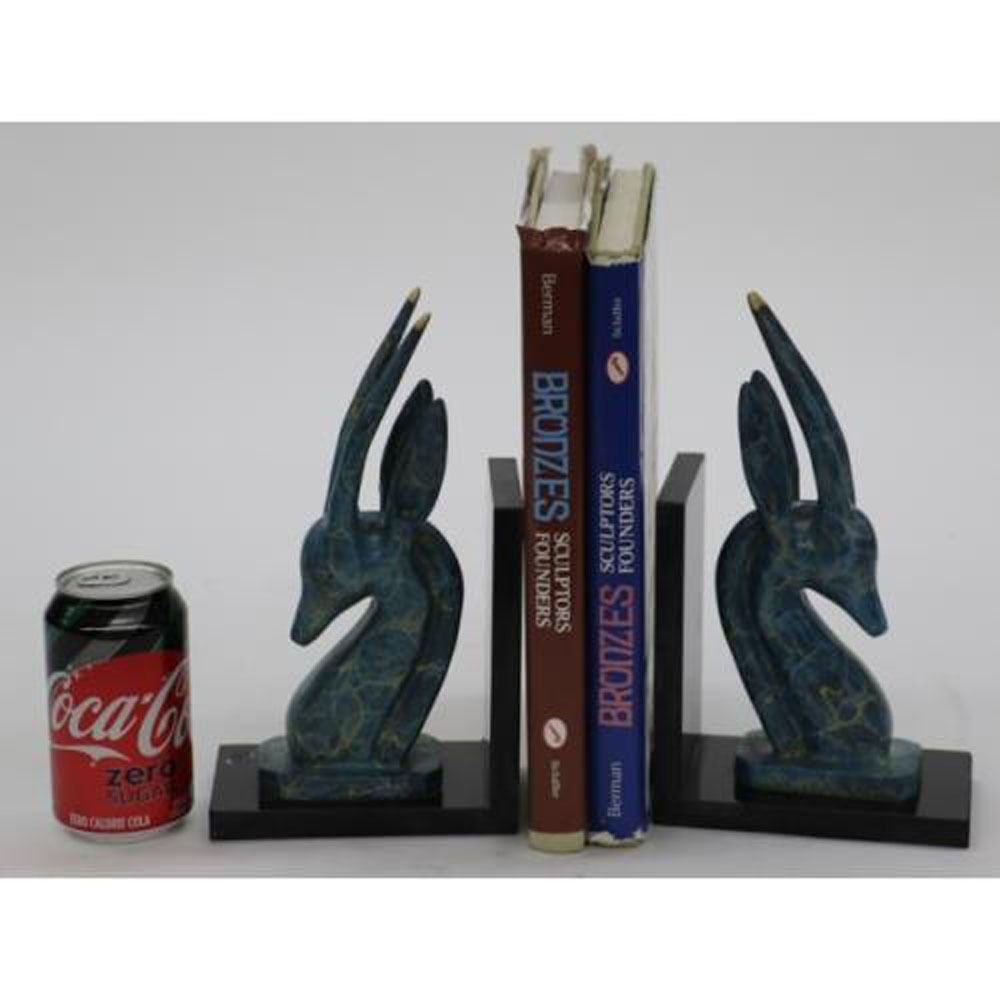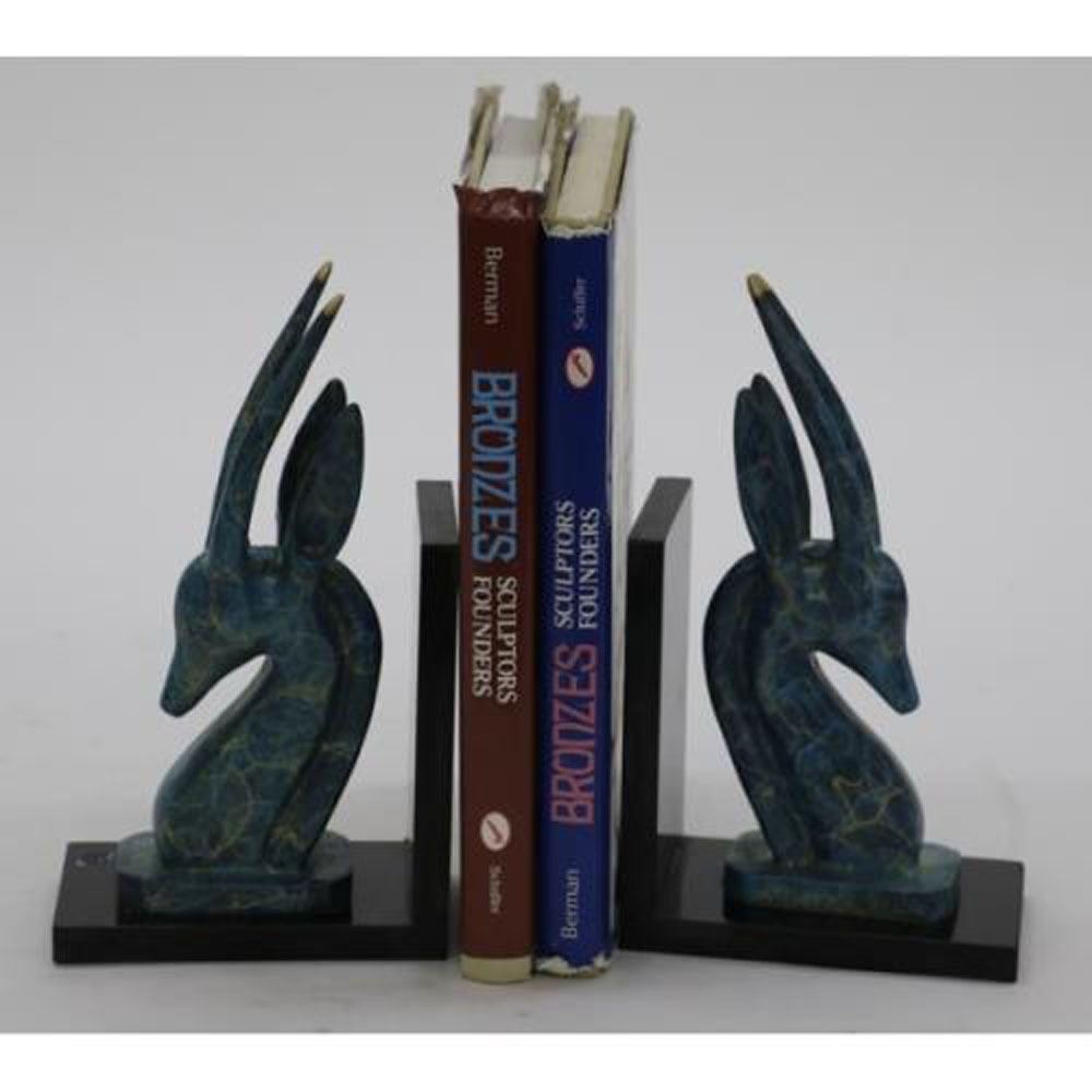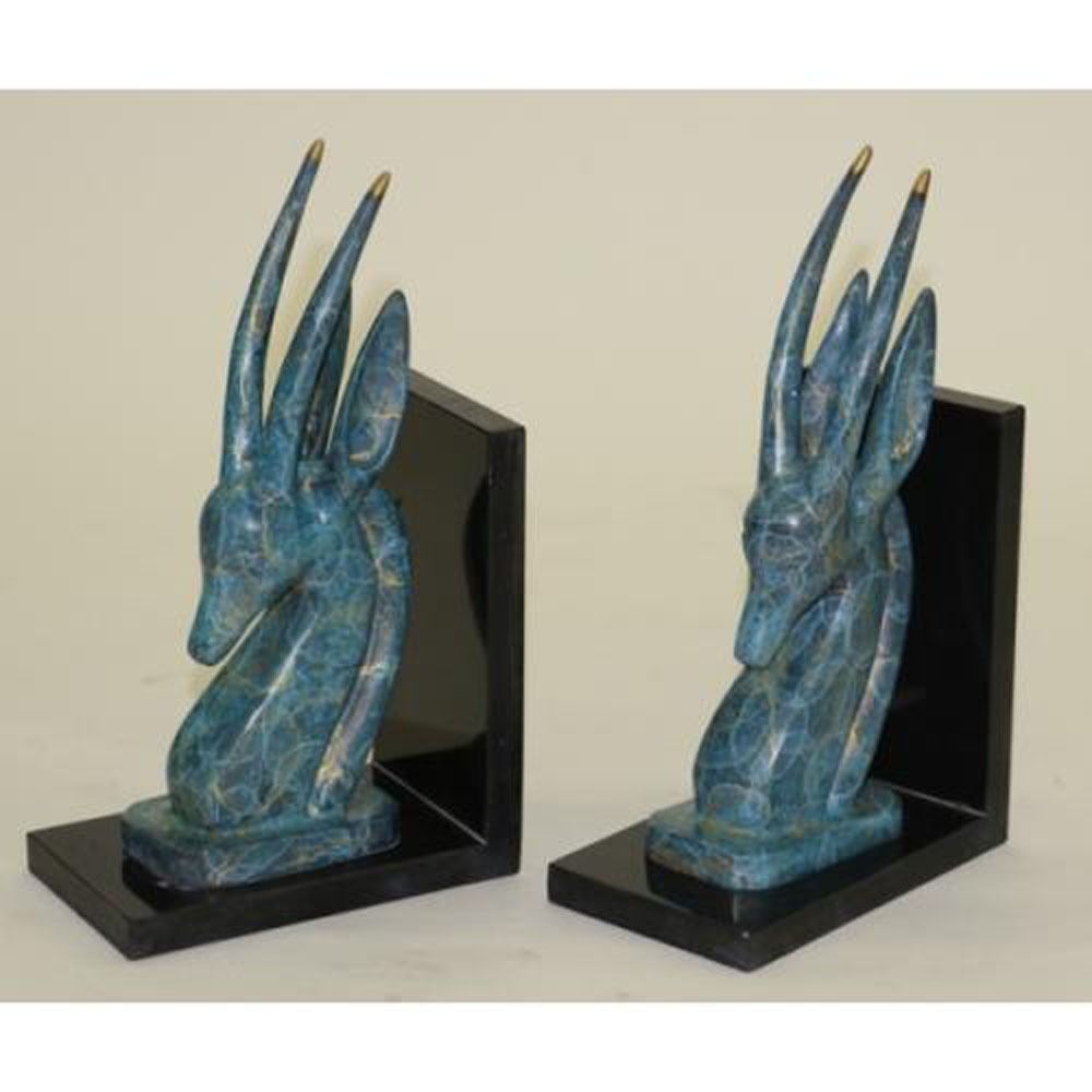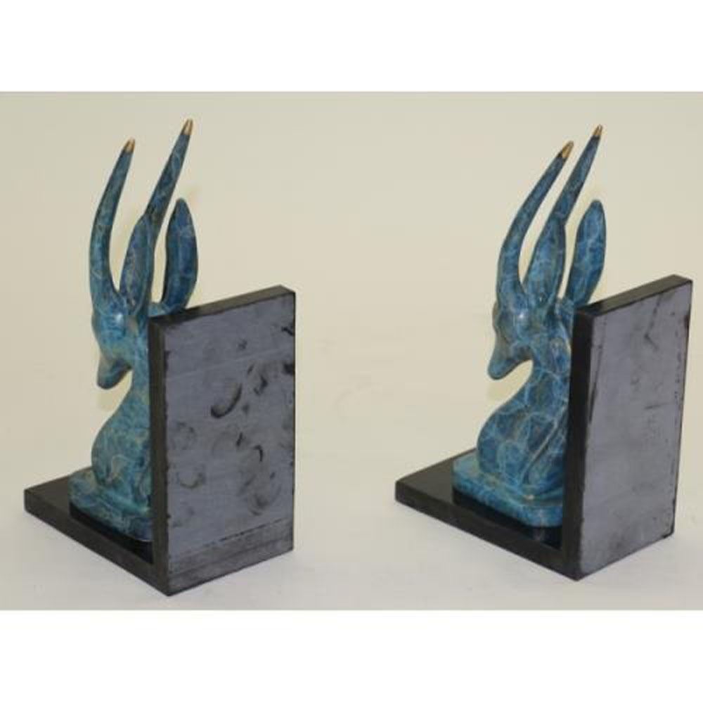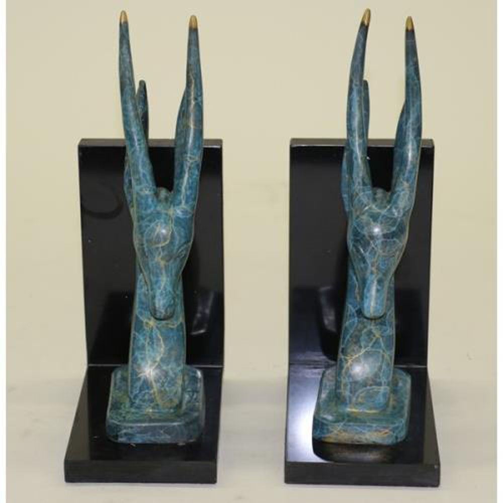 This is a set of two Bronze bookends Sculpture for your bookshelves or as desk accessories. These are rams, ibex, impala, or antelope gazelles. They have felt on the bottom to protect your furnishings. These two bookends are unlike any others I have seen. They have no defined facial features. The head is smooth and sleek with only a mouth. These are a classic mid century modern design. Perfect addition to your home office, study, or library decor. Each Bronze Dimensions: Height 10 X Width 6 Inches. Total Weight: 10 LBS.