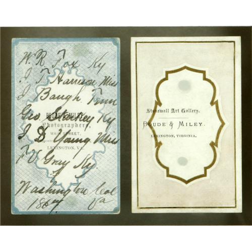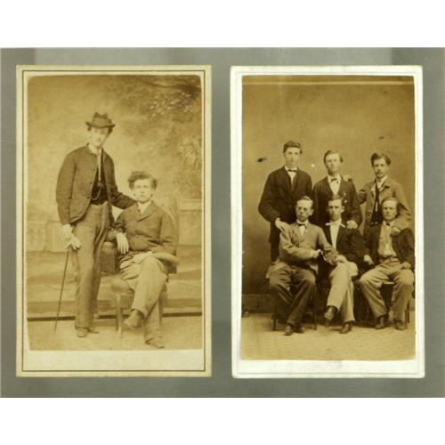 <B> Two "General Lee's Boys" CDV's.</B></I> Two CDV images with Bodue & Miley backmarks, Lexington, Virginia, 1867. After the War Between the States, General Robert E. Lee accepted the presidency of Washington College in Lexington, Virginia and once again found himself a leader of young Southern men. The students captured in these images were members of the Class of 1867 and no doubt were Confederate veterans completing their educations. One CDV shows two fellows, one of whom is wearing the black-striped gray trousers associated with the Liberty Hall Volunteers, which became Company I, 4th Virginia Infantry during the war. The second image shows six students, all of whom are identified on the verso as follows: W.R. Fox of Kentucky, J.T. Harrison of Mississippi, J. Baugh of Tennessee, George Starkey of Kentucky, J.D. Young of Mississippi, and F.V. Grey of Kentucky. One tiny abrasion on the second image, else Very Good condition. <BR><BR><B>Important notice:</