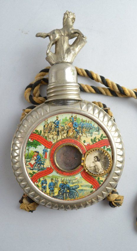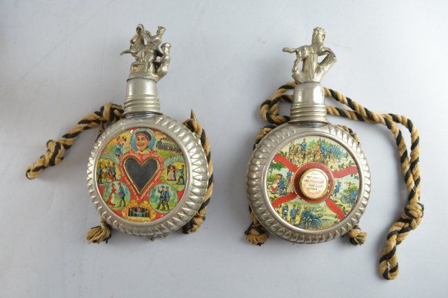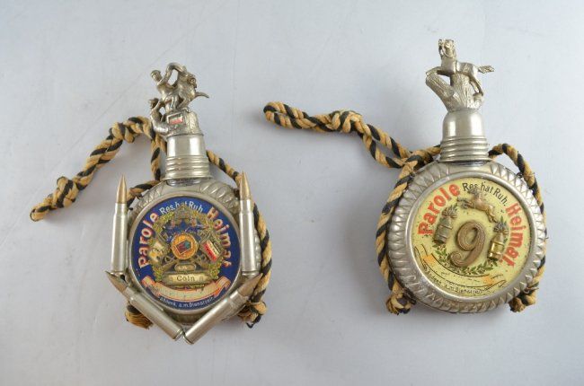 Two German 1st World War trench made flasks decorated with badges, shell cases etc both 9" high
