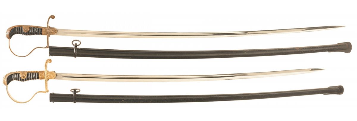 1) Holler Army Sword, 38" long, 33" blade, brass guard, black celluloid grip, black enamel sheath. 2) Eickhorn Army Sword, 35 3/4" long, 31" blade, gold painted alloy guard, enamel sheath.