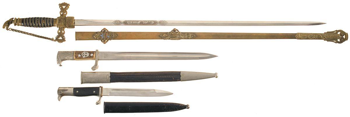 1) Knights of the Blue Cross of the World fraternal sword, 28" straight blade, "C.M.Smith" etched with "COMDY/ No5" marking, brass hilt, chain guard, wire wrapped leather grip and brass sheath with raised enamel filled designs. In very good condition. 2) Nazi police dress bayonet, 13" blade, Alexander Coppel marked, "S.L1.63." unit marked guard, oak leaf and eagle head hilt, stag grips and leather and nickel sheath. 3) Anton Wingen bayonet, 7 5/8" blade, checkered grips, nickel finish hilt and metal sheath. All are good or better.