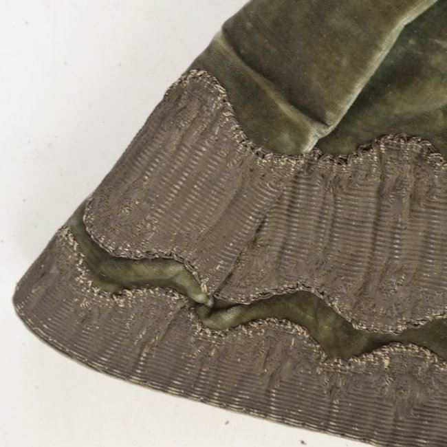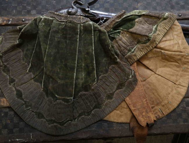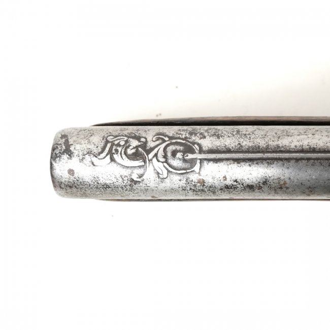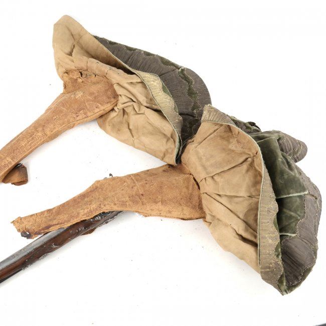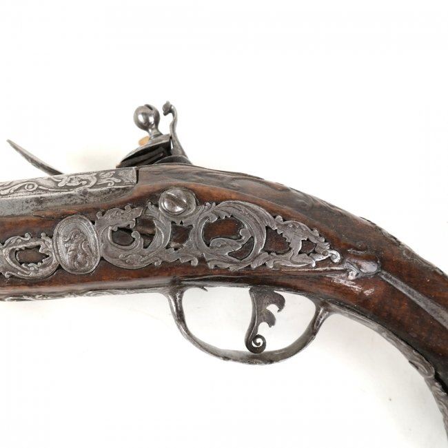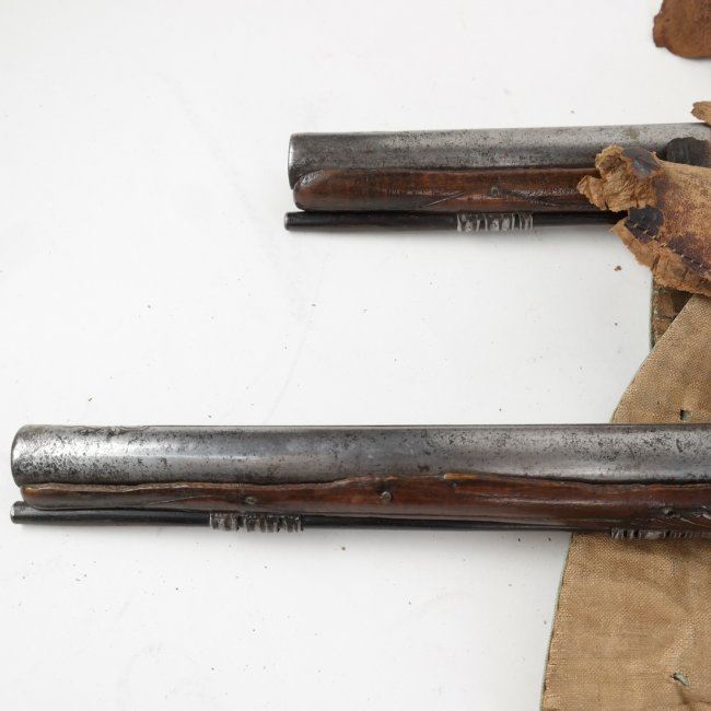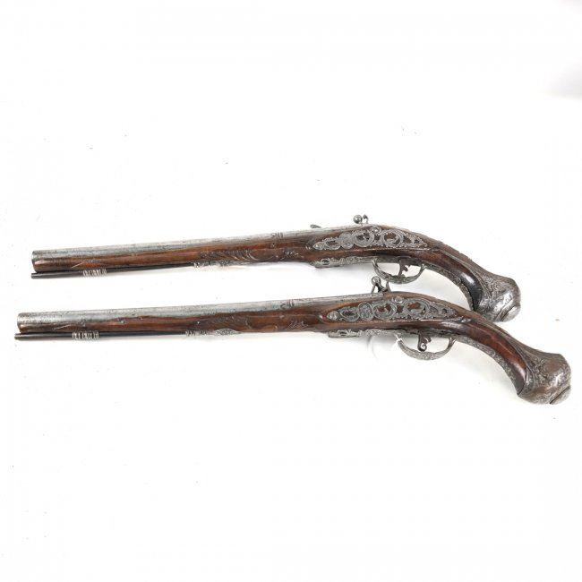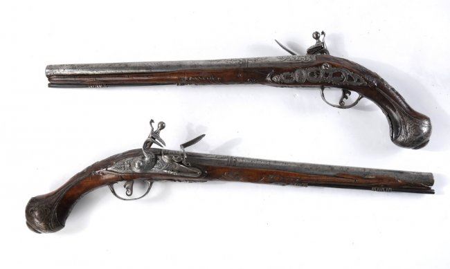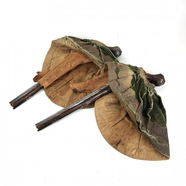 Two 18th century matched flintlock pistols, in ebony, with silver chased inlay. Altered stocks, including green velvet and embroidered holsters. [15 1/8" L]. Overall good condition.