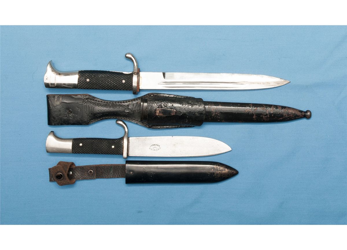 1) German K98 dress bayonet with a 7 3/4 inch blade and metal scabbard. 2) Hitler youth knife with a 5 3/8 inch and metal sheath. CONDITION: Good to very good.