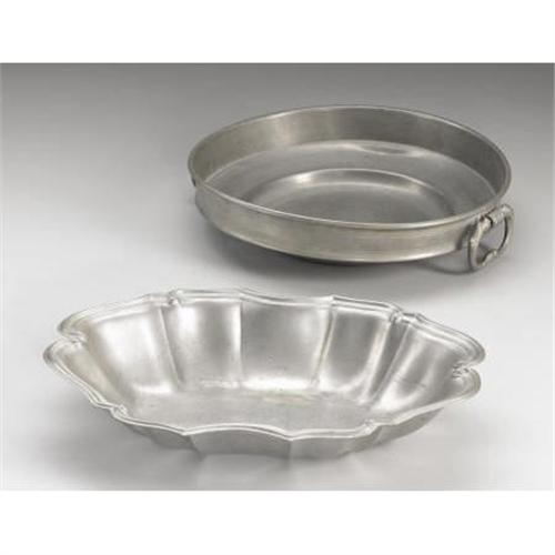 <B>Two German Pewter Bowls</B></I><BR>Unknown makers, Germany <BR>Nineteenth and Twentieth Centuries<BR>Pewter<BR>Various marks <BR>13.5 inch and 12.5 inch diameters <BR> <BR>Two pewter bowls, one of lobed basin form, the other of round form with bail handles.<B>Condition Report:</B> Normal signs of wear as appropriate with age; denting.<BR><BR><b>Shipping:</b> Bottles, Jars & Containers (<a target="_blank" href="http://www.heritageauctions.com/common/shipping.php">view shipping information</a>)