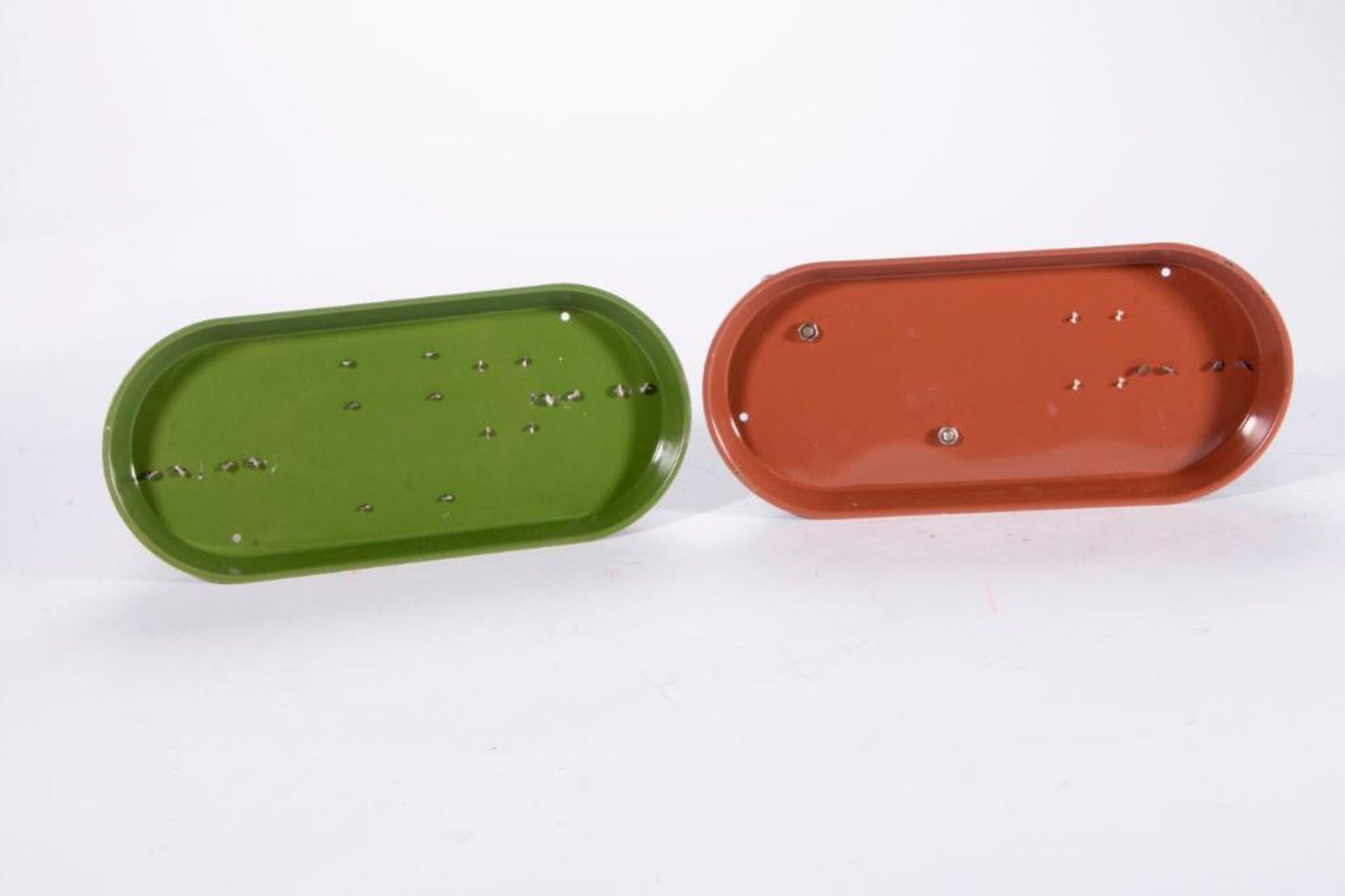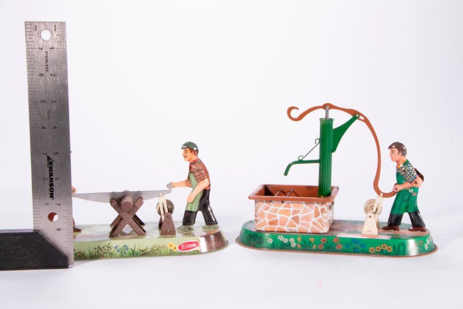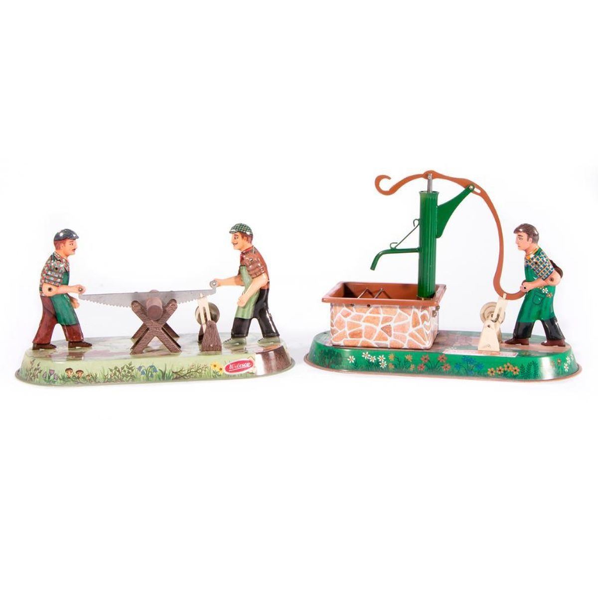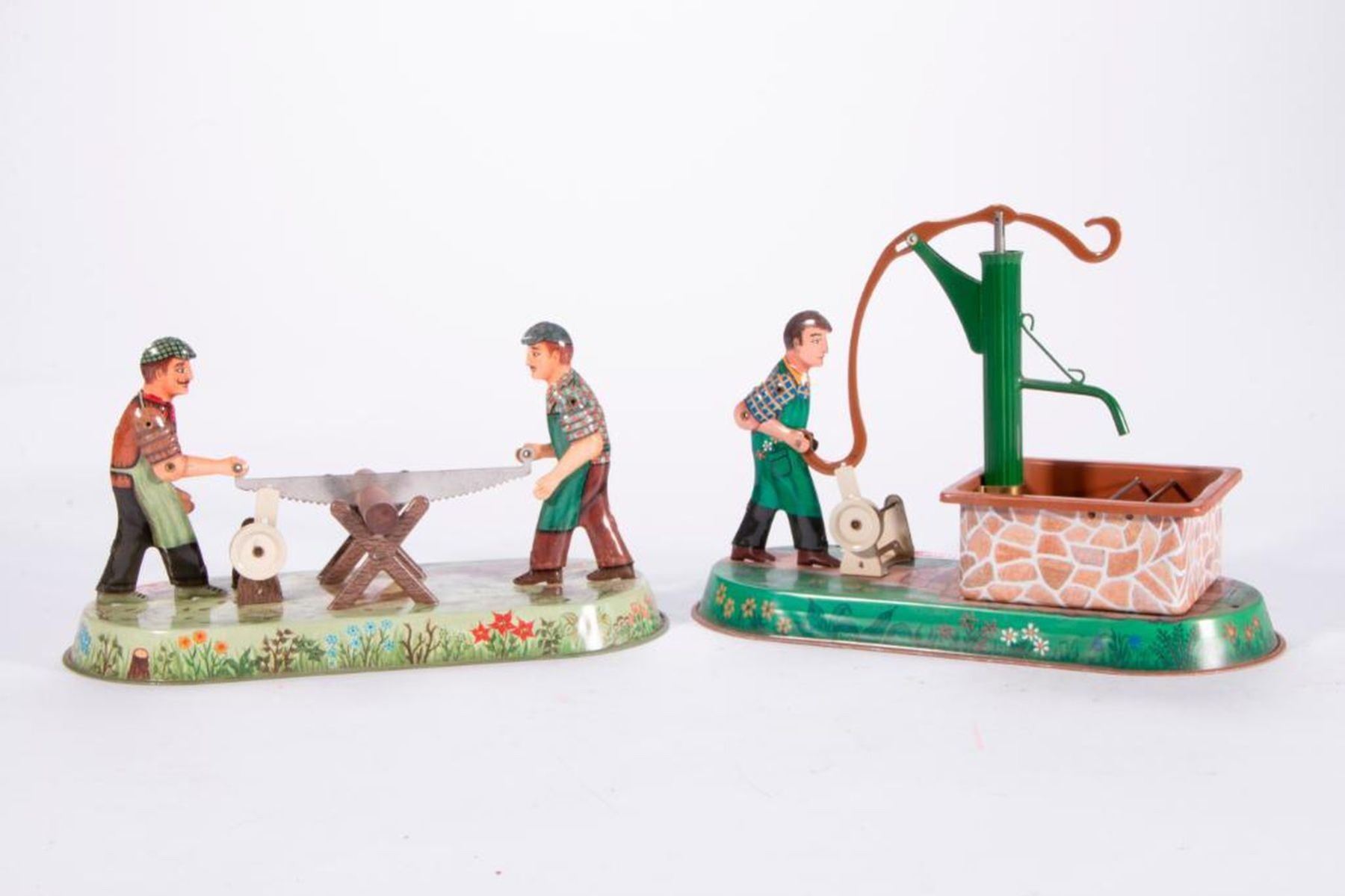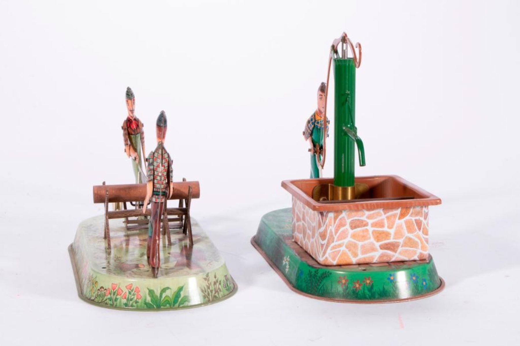 Two German Wilesco toys depicting a hand saw and a hand pump. Largest measures 7 inches high x 9 x 4. Items are sold as is. Please inquire about condition if not otherwise stated.